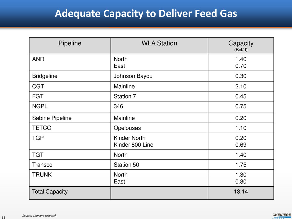 Local Pipeline Interconnections Targa Columbia Gulf Tennessee Cheniere Creole Trail Pipeline Trunkline Kinder Morgan Louisiana Pipeline NGPL Texas to Louisiana (bi-directional) Transco TETCO Tennessee FGT SW Lateral (Trn, TN, FGT) Existing Pipeline Grid Transco Z3 Sabine Pine Prairie Energy Center Egan Storage Jefferson Island Storage Creole Trail LNG (certificated) Pine Prairie Texas Gas ANR Florida Gas Z2 . Cameron LNG . Tennessee Trunkline Columbia Trunkline LNG . NGPL Transco Florida Gas Z1 Tennessee Bridgeline . NGPL Texas Eastern Trunkline Transco Z3 34