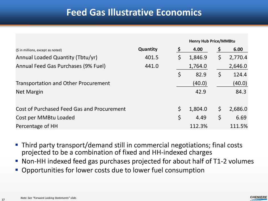 Feed Gas Illustrative Economics Third party transport/demand still in commercial negotiations; final costs projected to be a combination of fixed and HH-indexed charges Non-HH indexed feed gas purchases projected for about half of T1-2 volumes Opportunities for lower costs due to lower fuel consumption 37 Henry Hub Price/MMBtu ($ in millions, except as noted) Quantity $ 4.00 $ 6.00 Annual Loaded Quantity (Tbtu/yr) 401.5 $ 1,846.9 $ 2,770.4 Annual Feed Gas Purchases (9% Fuel) 441.0 1,764.0 2,646.0 $ 82.9 $ 124.4 Transportation and Other Procurement (40.0) (40.0) Net Margin 42.9 84.3 Cost of Purchased Feed Gas and Procurement $ 1,804.0 $ 2,686.0 Cost per MMBtu Loaded $ 4.49 $ 6.69 Percentage of HH 112.3% 111.5% Note: See “Forward Looking Statements” slide.