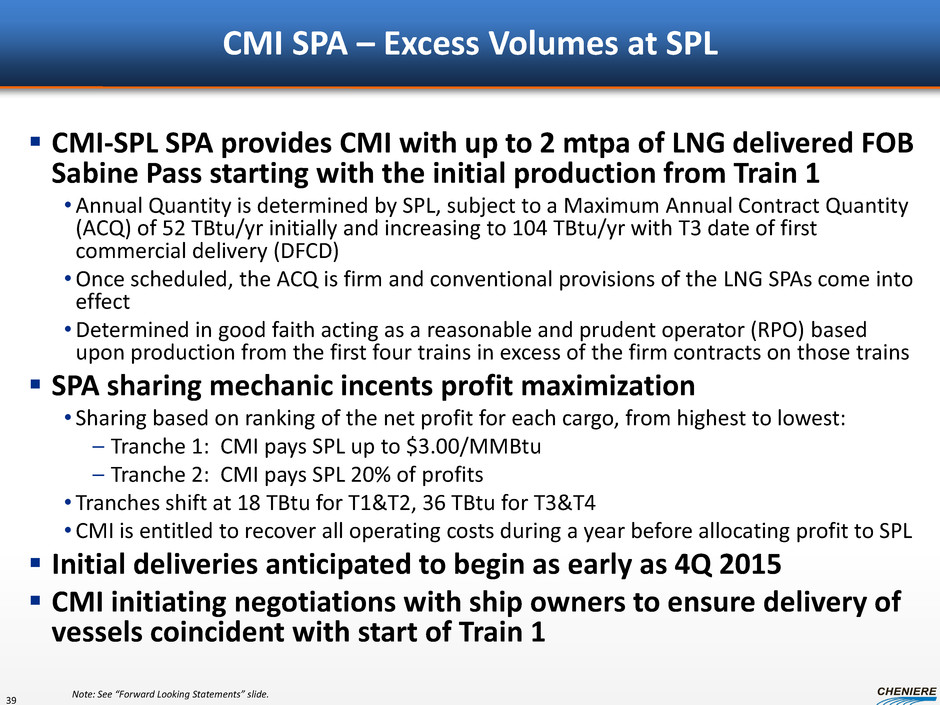 CMI SPA – Excess Volumes at SPL CMI-SPL SPA provides CMI with up to 2 mtpa of LNG delivered FOB Sabine Pass starting with the initial production from Train 1 •Annual Quantity is determined by SPL, subject to a Maximum Annual Contract Quantity (ACQ) of 52 TBtu/yr initially and increasing to 104 TBtu/yr with T3 date of first commercial delivery (DFCD) •Once scheduled, the ACQ is firm and conventional provisions of the LNG SPAs come into effect •Determined in good faith acting as a reasonable and prudent operator (RPO) based upon production from the first four trains in excess of the firm contracts on those trains SPA sharing mechanic incents profit maximization • Sharing based on ranking of the net profit for each cargo, from highest to lowest: – Tranche 1: CMI pays SPL up to $3.00/MMBtu – Tranche 2: CMI pays SPL 20% of profits • Tranches shift at 18 TBtu for T1&T2, 36 TBtu for T3&T4 •CMI is entitled to recover all operating costs during a year before allocating profit to SPL Initial deliveries anticipated to begin as early as 4Q 2015 CMI initiating negotiations with ship owners to ensure delivery of vessels coincident with start of Train 1 39 Note: See “Forward Looking Statements” slide.