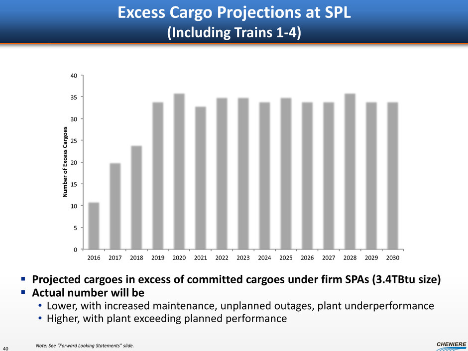 Excess Cargo Projections at SPL (Including Trains 1-4) Projected cargoes in excess of committed cargoes under firm SPAs (3.4TBtu size) Actual number will be • Lower, with increased maintenance, unplanned outages, plant underperformance • Higher, with plant exceeding planned performance 0 5 10 15 20 25 30 35 40 2016 2017 2018 2019 2020 2021 2022 2023 2024 2025 2026 2027 2028 2029 2030 Nu mb er of Ex ce ss Ca rgo es 40 Note: See “Forward Looking Statements” slide.