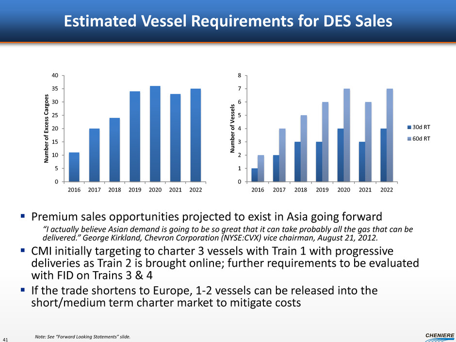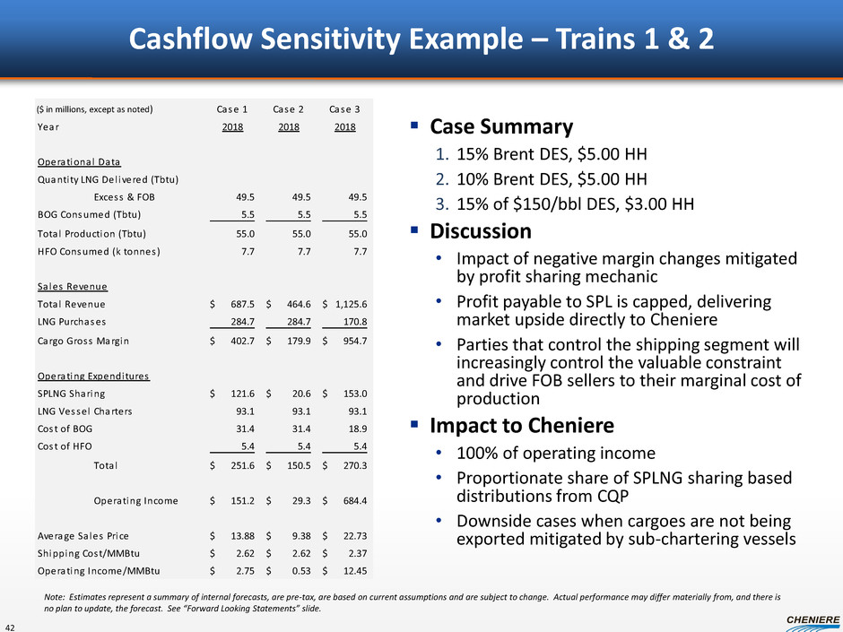 Estimated Vessel Requirements for DES Sales Premium sales opportunities projected to exist in Asia going forward “I actually believe Asian demand is going to be so great that it can take probably all the gas that can be delivered.” George Kirkland, Chevron Corporation (NYSE:CVX) vice chairman, August 21, 2012. CMI initially targeting to charter 3 vessels with Train 1 with progressive deliveries as Train 2 is brought online; further requirements to be evaluated with FID on Trains 3 & 4 If the trade shortens to Europe, 1-2 vessels can be released into the short/medium term charter market to mitigate costs 0 1 2 3 4 5 6 7 8 2016 2017 2018 2019 2020 2021 2022 N u m b e r o f Vessel s 30d RT 60d RT 0 5 10 15 20 25 30 35 40 2016 2017 2018 2019 2020 2021 2022 N u m b e r o f Exc e ss Ca rg o e s 41 Note: See “Forward Looking Statements” slide.
