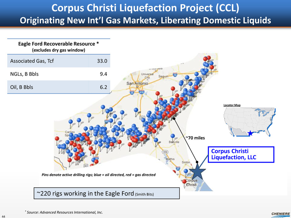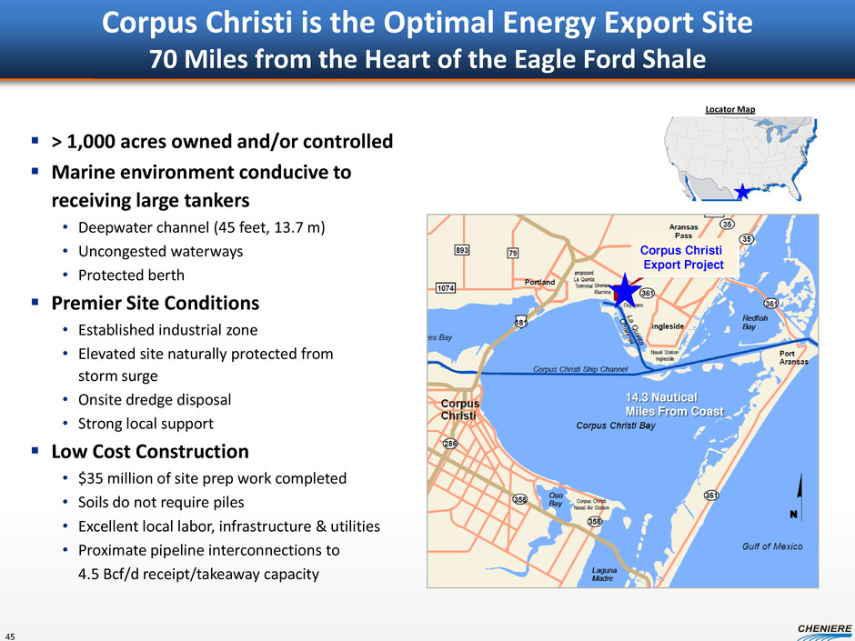 Corpus Christi Liquefaction Project (CCL) Originating New Int’l Gas Markets, Liberating Domestic Liquids ~220 rigs working in the Eagle Ford (Smith Bits) Locator Map Corpus Christi Liquefaction, LLC Eagle Ford Recoverable Resource * (excludes dry gas window) Associated Gas, Tcf 33.0 NGLs, B Bbls 9.4 Oil, B Bbls 6.2 ~70 miles * Source: Advanced Resources International, Inc. Pins denote active drilling rigs; blue = oil directed, red = gas directed 44