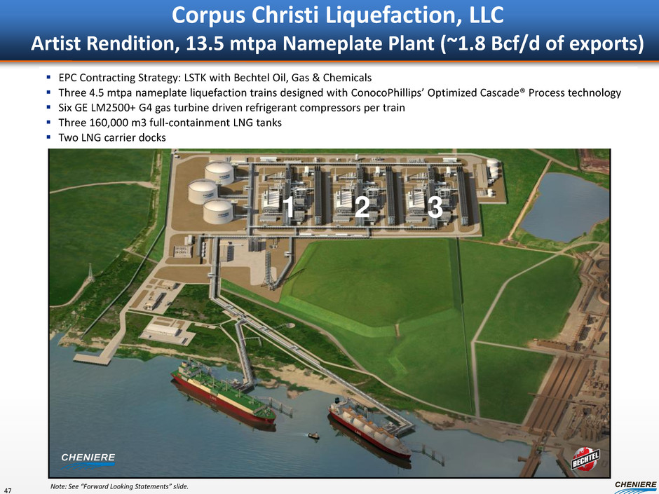 1 2 3 EPC Contracting Strategy: LSTK with Bechtel Oil, Gas & Chemicals Three 4.5 mtpa nameplate liquefaction trains designed with ConocoPhillips’ Optimized Cascade® Process technology Six GE LM2500+ G4 gas turbine driven refrigerant compressors per train Three 160,000 m3 full-containment LNG tanks Two LNG carrier docks Corpus Christi Liquefaction, LLC Artist Rendition, 13.5 mtpa Nameplate Plant (~1.8 Bcf/d of exports) Note: See “Forward Looking Statements” slide. 47