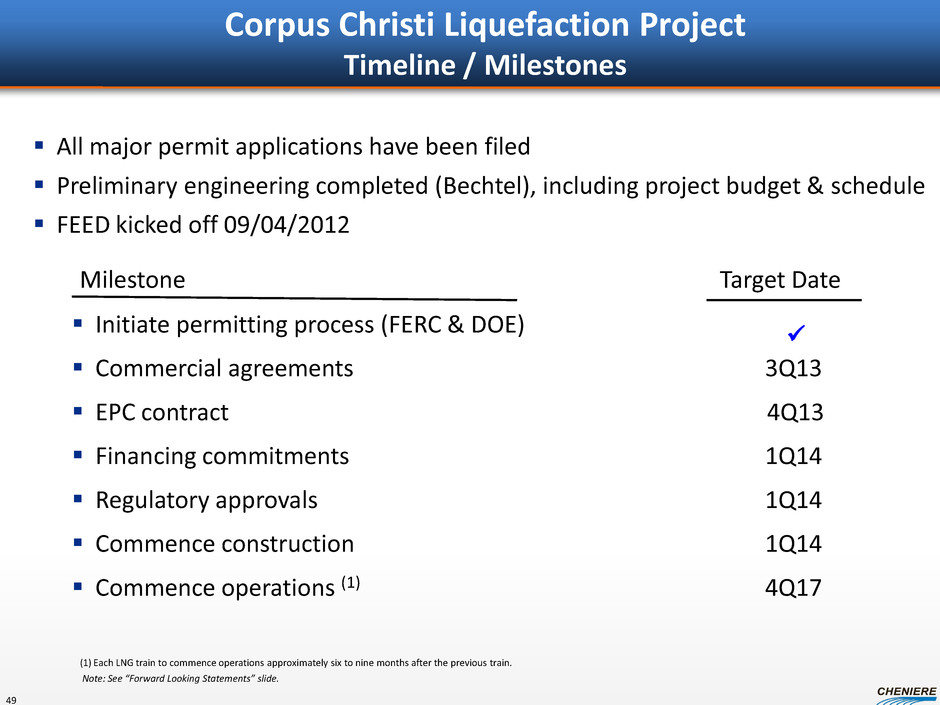 Corpus Christi Liquefaction Project Timeline / Milestones All major permit applications have been filed Preliminary engineering completed (Bechtel), including project budget & schedule FEED kicked off 09/04/2012 Initiate permitting process (FERC & DOE) Commercial agreements 3Q13 EPC contract 4Q13 Financing commitments 1Q14 Regulatory approvals 1Q14 Commence construction 1Q14 Commence operations (1) 4Q17 Milestone Target Date (1) Each LNG train to commence operations approximately six to nine months after the previous train. Note: See “Forward Looking Statements” slide. 49