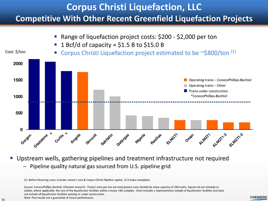 0 500 1000 1500 2000 Go rgo n Gla dst on e Cu rtis An gol a Sh no vit Sak hal in Qa tar gas Nig eria Ra sG as EL NG T1 Om an AL NG T1 AL NG T1- 3 EL NG T1- 2 Corpus Christi Liquefaction, LLC Competitive With Other Recent Greenfield Liquefaction Projects (1) Before financing costs, includes owner’s cost & Corpus Christi Pipeline capital, 13.5 mtpa nameplate. Source: ConocoPhillips-Bechtel, Cheniere research. Project costs per ton are total project costs divided by mtpa capacity of LNG trains. Figures do not attempt to isolate, where applicable, the cost of the liquefaction facilities within a major LNG complex. Chart includes a representative sample of liquefaction facilities and does not include all liquefaction facilities existing or under construction. Note: Past results not a guarantee of future performance. *ConocoPhillips-Bechtel Cost: $/ton Upstream wells, gathering pipelines and treatment infrastructure not required – Pipeline quality natural gas sourced from U.S. pipeline grid Trains under construction Range of liquefaction project costs: $200 - $2,000 per ton 1 Bcf/d of capacity = $1.5 B to $15.0 B Corpus Christi Liquefaction project estimated to be ~$800/ton (1) * * Operating trains – ConocoPhillips-Bechtel Operating trains – Other 50