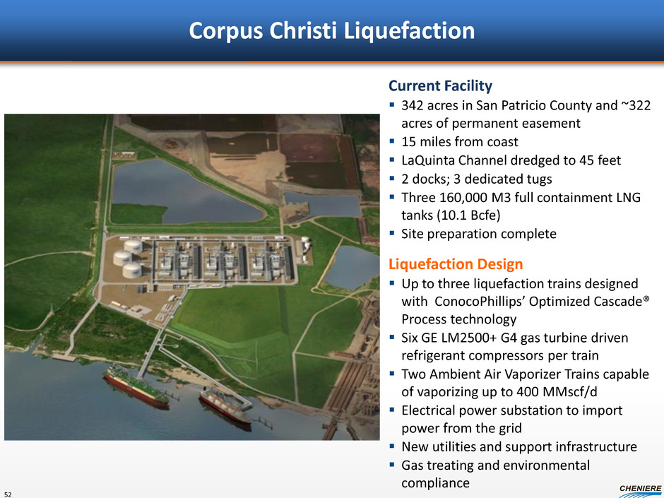 Corpus Christi Liquefaction Current Facility 342 acres in San Patricio County and ~322 acres of permanent easement 15 miles from coast LaQuinta Channel dredged to 45 feet 2 docks; 3 dedicated tugs Three 160,000 M3 full containment LNG tanks (10.1 Bcfe) Site preparation complete Liquefaction Design Up to three liquefaction trains designed with ConocoPhillips’ Optimized Cascade® Process technology Six GE LM2500+ G4 gas turbine driven refrigerant compressors per train Two Ambient Air Vaporizer Trains capable of vaporizing up to 400 MMscf/d Electrical power substation to import power from the grid New utilities and support infrastructure Gas treating and environmental compliance 52