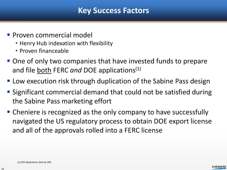 Key Success Factors Proven commercial model • Henry Hub indexation with flexibility • Proven financeable One of only two companies that have invested funds to prepare and file both FERC and DOE applications(1) Low execution risk through duplication of the Sabine Pass design Significant commercial demand that could not be satisfied during the Sabine Pass marketing effort Cheniere is recognized as the only company to have successfully navigated the US regulatory process to obtain DOE export license and all of the approvals rolled into a FERC license (1) DOE Applications filed by CMI. 53