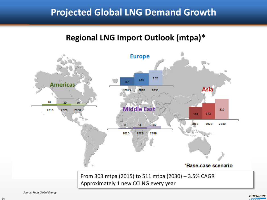 Projected Global LNG Demand Growth 54 From 303 mtpa (2015) to 511 mtpa (2030) – 3.5% CAGR Approximately 1 new CCLNG every year Regional LNG Import Outlook (mtpa)* Source: Facts Global Energy