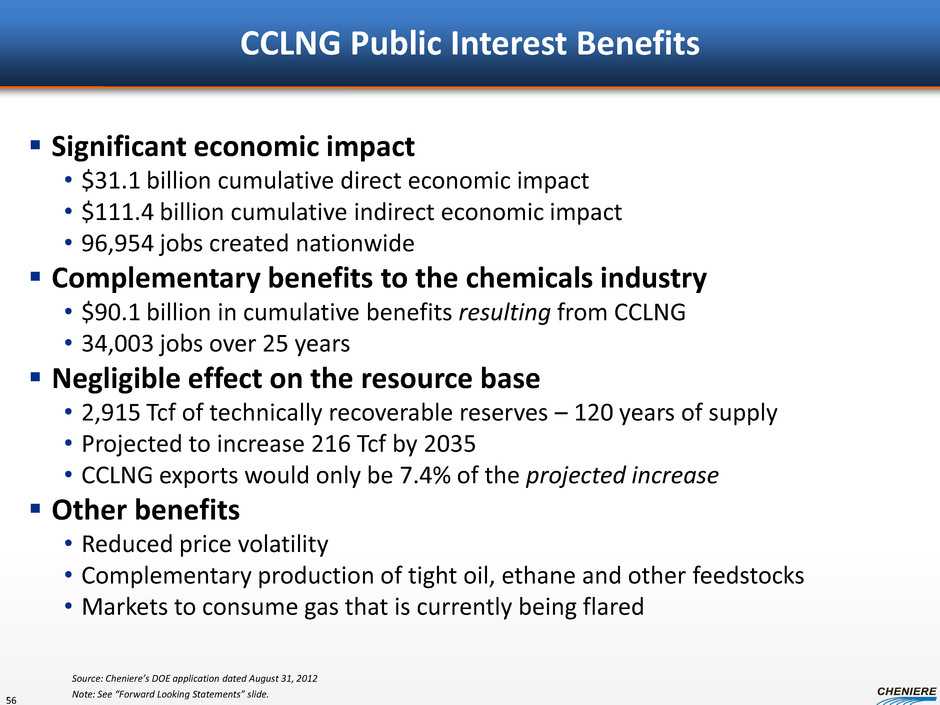 CCLNG Public Interest Benefits Significant economic impact • $31.1 billion cumulative direct economic impact • $111.4 billion cumulative indirect economic impact • 96,954 jobs created nationwide Complementary benefits to the chemicals industry • $90.1 billion in cumulative benefits resulting from CCLNG • 34,003 jobs over 25 years Negligible effect on the resource base • 2,915 Tcf of technically recoverable reserves – 120 years of supply • Projected to increase 216 Tcf by 2035 • CCLNG exports would only be 7.4% of the projected increase Other benefits • Reduced price volatility • Complementary production of tight oil, ethane and other feedstocks • Markets to consume gas that is currently being flared 56 Source: Cheniere’s DOE application dated August 31, 2012 Note: See “Forward Looking Statements” slide.