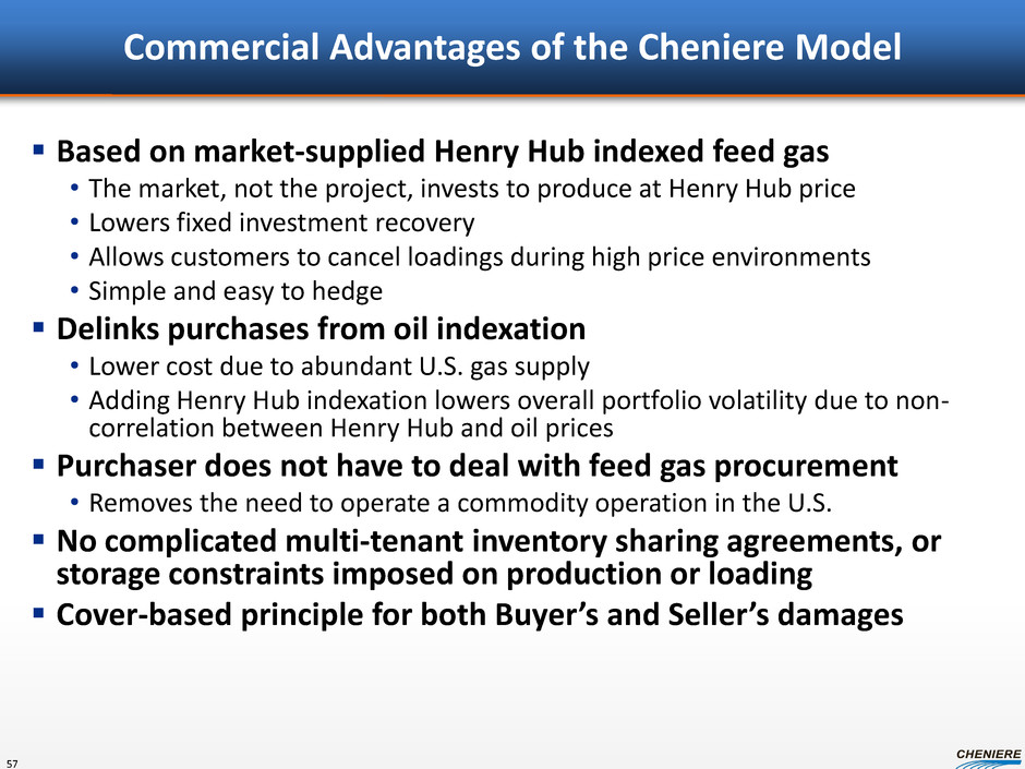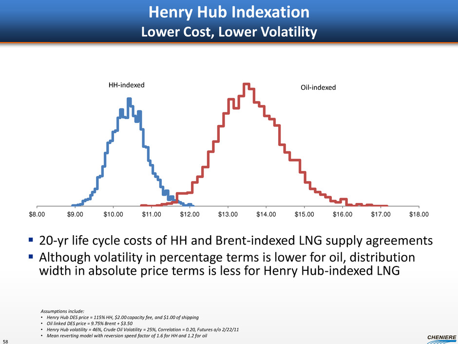 Commercial Advantages of the Cheniere Model Based on market-supplied Henry Hub indexed feed gas • The market, not the project, invests to produce at Henry Hub price • Lowers fixed investment recovery • Allows customers to cancel loadings during high price environments • Simple and easy to hedge Delinks purchases from oil indexation • Lower cost due to abundant U.S. gas supply • Adding Henry Hub indexation lowers overall portfolio volatility due to non- correlation between Henry Hub and oil prices Purchaser does not have to deal with feed gas procurement • Removes the need to operate a commodity operation in the U.S. No complicated multi-tenant inventory sharing agreements, or storage constraints imposed on production or loading Cover-based principle for both Buyer’s and Seller’s damages 57