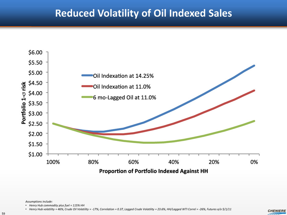 Henry Hub Indexation Lower Cost, Lower Volatility 20-yr life cycle costs of HH and Brent-indexed LNG supply agreements Although volatility in percentage terms is lower for oil, distribution width in absolute price terms is less for Henry Hub-indexed LNG $8.00 $9.00 $10.00 $11.00 $12.00 $13.00 $14.00 $15.00 $16.00 $17.00 $18.00 HH-indexed Oil-indexed 58 Assumptions include: • Henry Hub DES price = 115% HH, $2.00 capacity fee, and $1.00 of shipping • Oil linked DES price = 9.75% Brent + $3.50 • Henry Hub volatility = 46%, Crude Oil Volatility = 25%, Correlation = 0.20, Futures a/o 2/22/11 • Mean reverting model with reversion speed factor of 1.6 for HH and 1.2 for oil