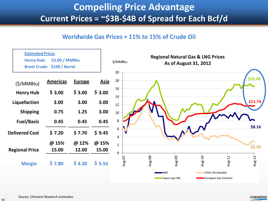 Estimated Prices Henry Hub: $3.00 / MMBtu Brent Crude: $100 / Barrel ($/MMBtu) Americas Europe Asia Henry Hub 3.00 $ 3.00 3.00 Fuel/Basis Shipping 0.75 1.25 3.00 0.45 0.45 0.45 $ 7.20 7.70 9.45 5.55 Regional Price @ 15% 15.00 12.00 15.00 Margin 7.80 $ 4.30 Liquefaction 3.00 3.00 3.00 Delivered Cost Source: Cheniere Research estimates Compelling Price Advantage Current Prices = ~$3B-$4B of Spread for Each Bcf/d @ 12% @ 15% $ $ $ $ $ $ Worldwide Gas Prices = 11% to 15% of Crude Oil 0 2 4 6 8 10 12 14 16 18 20 Au g- 0 7 Au g- 0 8 Au g- 0 9 Au g- 1 0 Au g- 1 1 Au g- 1 2 $/MMBtu Regional Natural Gas & LNG Prices As of August 31, 2012 NBP IFERC HH Monthly Japan avg LNG European Gas Contract $2.90 $8.16 $11.74 $16.58 60