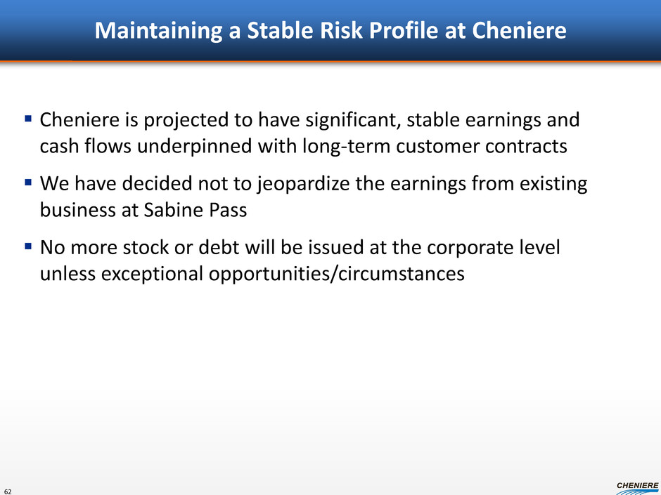 Cheniere is projected to have significant, stable earnings and cash flows underpinned with long-term customer contracts We have decided not to jeopardize the earnings from existing business at Sabine Pass No more stock or debt will be issued at the corporate level unless exceptional opportunities/circumstances Maintaining a Stable Risk Profile at Cheniere 62