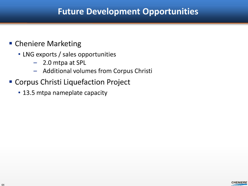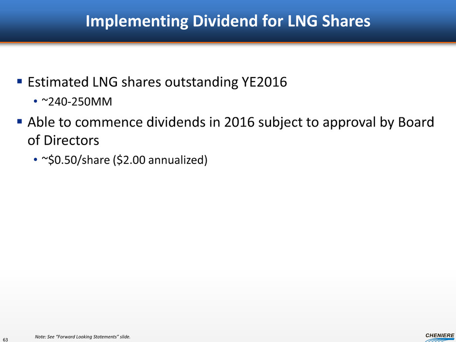 Implementing Dividend for LNG Shares Estimated LNG shares outstanding YE2016 • ~240-250MM Able to commence dividends in 2016 subject to approval by Board of Directors • ~$0.50/share ($2.00 annualized) Note: See “Forward Looking Statements” slide. 63