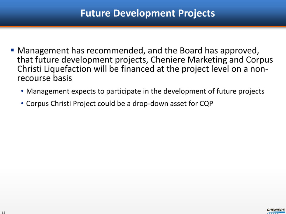 Cheniere Marketing • LNG exports / sales opportunities – 2.0 mtpa at SPL – Additional volumes from Corpus Christi Corpus Christi Liquefaction Project • 13.5 mtpa nameplate capacity Future Development Opportunities 64