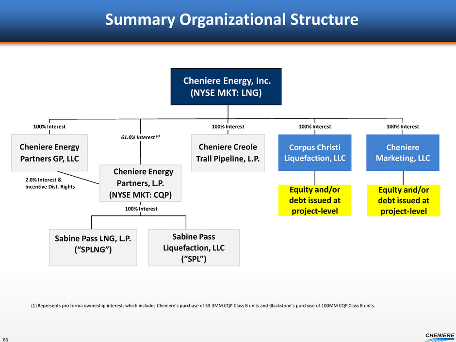 2.0% Interest & Incentive Dist. Rights Cheniere Energy, Inc. (NYSE MKT: LNG) Sabine Pass LNG, L.P. (“SPLNG”) Sabine Pass Liquefaction, LLC (“SPL”) Cheniere Energy Partners, L.P. (NYSE MKT: CQP) Cheniere Creole Trail Pipeline, L.P. Corpus Christi Liquefaction, LLC Cheniere Marketing, LLC Cheniere Energy Partners GP, LLC 61.0% Interest (1) 100% Interest 100% Interest 100% Interest 100% Interest 100% Interest (1) Represents pro forma ownership interest, which includes Cheniere’s purchase of 33.3MM CQP Class B units and Blackstone’s purchase of 100MM CQP Class B units. Summary Organizational Structure Equity and/or debt issued at project-level Equity and/or debt issued at project-level 66