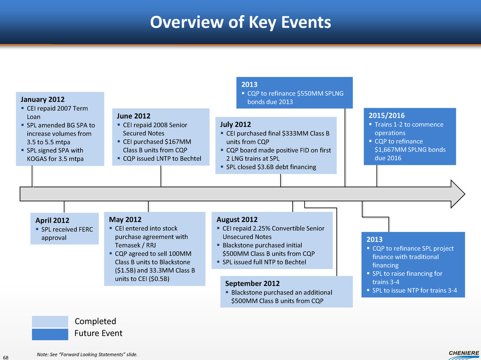 Overview of Key Events January 2012 CEI repaid 2007 Term Loan SPL amended BG SPA to increase volumes from 3.5 to 5.5 mtpa SPL signed SPA with KOGAS for 3.5 mtpa April 2012 SPL received FERC approval May 2012 CEI entered into stock purchase agreement with Temasek / RRJ CQP agreed to sell 100MM Class B units to Blackstone ($1.5B) and 33.3MM Class B units to CEI ($0.5B) Completed Future Event June 2012 CEI repaid 2008 Senior Secured Notes CEI purchased $167MM Class B units from CQP CQP issued LNTP to Bechtel July 2012 CEI purchased final $333MM Class B units from CQP CQP board made positive FID on first 2 LNG trains at SPL SPL closed $3.6B debt financing August 2012 CEI repaid 2.25% Convertible Senior Unsecured Notes Blackstone purchased initial $500MM Class B units from CQP SPL issued full NTP to Bechtel 2013 CQP to refinance $550MM SPLNG bonds due 2013 2013 CQP to refinance SPL project finance with traditional financing SPL to raise financing for trains 3-4 SPL to issue NTP for trains 3-4 2015/2016 Trains 1-2 to commence operations CQP to refinance $1,667MM SPLNG bonds due 2016 Note: See “Forward Looking Statements” slide. 68 September 2012 Blackstone purchased an additional $500MM Class B units from CQP