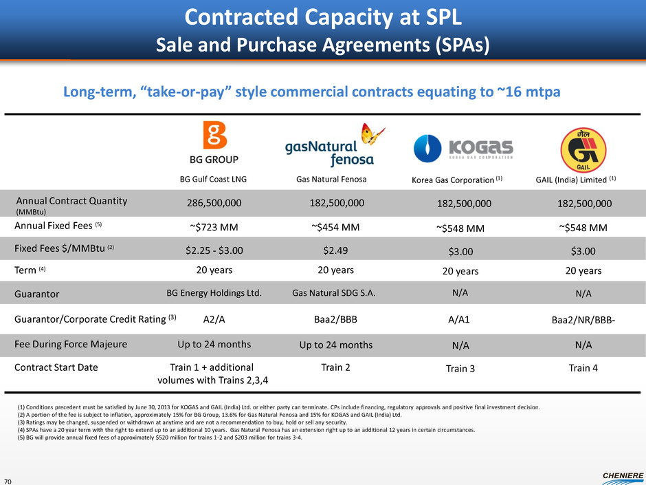 Contracted Capacity at SPL Sale and Purchase Agreements (SPAs) (1) Conditions precedent must be satisfied by June 30, 2013 for KOGAS and GAIL (India) Ltd. or either party can terminate. CPs include financing, regulatory approvals and positive final investment decision. (2) A portion of the fee is subject to inflation, approximately 15% for BG Group, 13.6% for Gas Natural Fenosa and 15% for KOGAS and GAIL (India) Ltd. (3) Ratings may be changed, suspended or withdrawn at anytime and are not a recommendation to buy, hold or sell any security. (4) SPAs have a 20 year term with the right to extend up to an additional 10 years. Gas Natural Fenosa has an extension right up to an additional 12 years in certain circumstances. (5) BG will provide annual fixed fees of approximately $520 million for trains 1-2 and $203 million for trains 3-4. BG Gulf Coast LNG Gas Natural Fenosa Annual Contract Quantity (MMBtu) 286,500,000 Fixed Fees $/MMBtu (2) Annual Fixed Fees (5) ~$723 MM ~$454 MM Term (4) Guarantor 20 years BG Energy Holdings Ltd. Gas Natural SDG S.A. Guarantor/Corporate Credit Rating (3) A2/A Baa2/BBB Fee During Force Majeure Up to 24 months Up to 24 months 20 years GAIL (India) Limited (1) ~$548 MM 20 years Baa2/NR/BBB- N/A Long-term, “take-or-pay” style commercial contracts equating to ~16 mtpa N/A Contract Start Date Train 1 + additional volumes with Trains 2,3,4 Train 2 Train 4 $2.25 - $3.00 $2.49 $3.00 182,500,000 182,500,000 20 years N/A N/A A/A1 Train 3 $3.00 ~$548 MM Korea Gas Corporation (1) 182,500,000 70