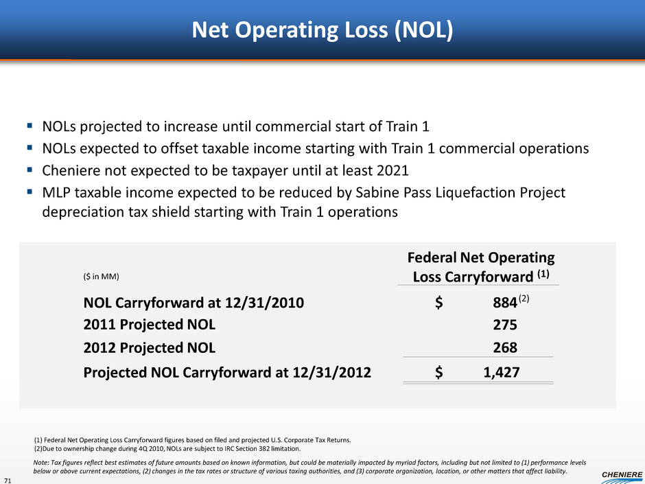 NOLs projected to increase until commercial start of Train 1 NOLs expected to offset taxable income starting with Train 1 commercial operations Cheniere not expected to be taxpayer until at least 2021 MLP taxable income expected to be reduced by Sabine Pass Liquefaction Project depreciation tax shield starting with Train 1 operations Net Operating Loss (NOL) Federal Net Operating Loss Carryforward (1) NOL Carryforward at 12/31/2010 884 $ 2011 Projected NOL 275 Projected NOL Carryforward at 12/31/2012 $ 2012 Projected NOL ($ in MM) 268 1,427 (1) Federal Net Operating Loss Carryforward figures based on filed and projected U.S. Corporate Tax Returns. (2)Due to ownership change during 4Q 2010, NOLs are subject to IRC Section 382 limitation. (2) Note: Tax figures reflect best estimates of future amounts based on known information, but could be materially impacted by myriad factors, including but not limited to (1) performance levels below or above current expectations, (2) changes in the tax rates or structure of various taxing authorities, and (3) corporate organization, location, or other matters that affect liability. 71