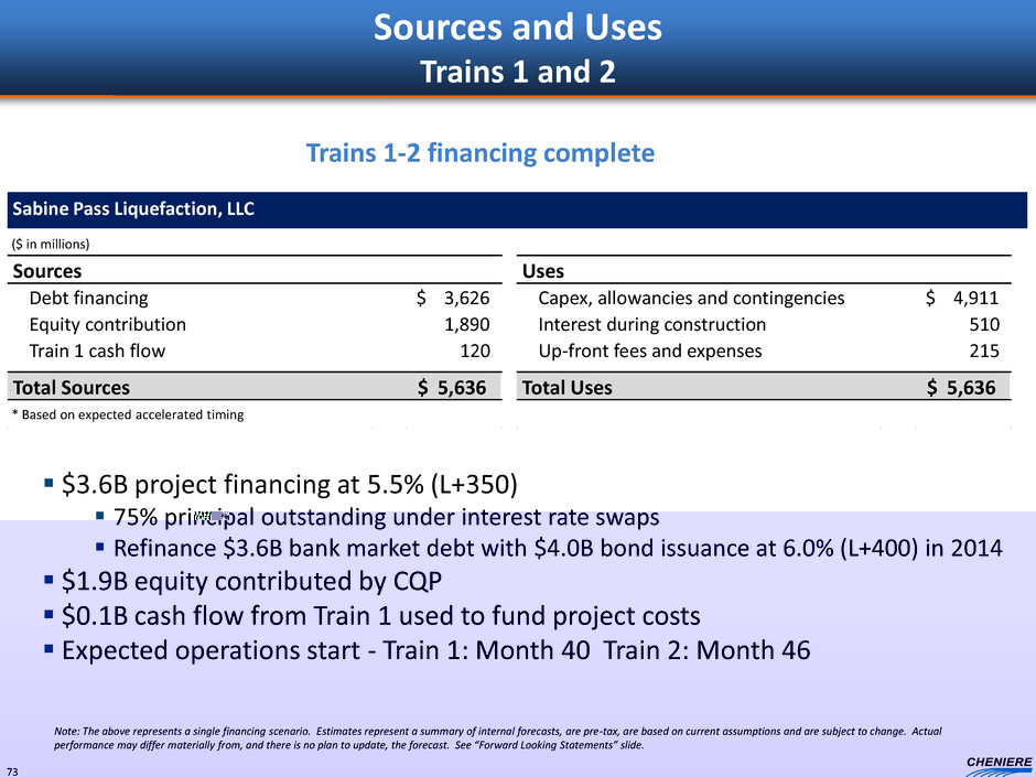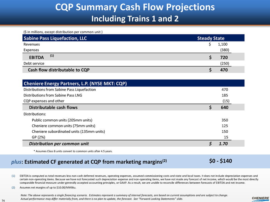 Sabine Pass Liquefaction, LLC Trains 1-2 financing complete Sources and Uses Trains 1 and 2 $3.6B project financing at 5.5% (L+350) 75% principal outstanding under interest rate swaps Refinance $3.6B bank market debt with $4.0B bond issuance at 6.0% (L+400) in 2014 $1.9B equity contributed by CQP $0.1B cash flow from Train 1 used to fund project costs Expected operations start - Train 1: Month 40 Train 2: Month 46 Sources Uses Debt financing 3,626 $ Capex, allowancies and contingencies 4,911 $ Equity contribution 1,890 Interest during construction 510 Train 1 cash flow 120 Up-front fees and expenses 215 Total Sources 5,636 $ Total Uses 5,636 $ * Based on expected accelerated timing ($ in millions) Note: The above represents a single financing scenario. Estimates represent a summary of internal forecasts, are pre-tax, are based on current assumptions and are subject to change. Actual performance may differ materially from, and there is no plan to update, the forecast. See “Forward Looking Statements” slide. 73
