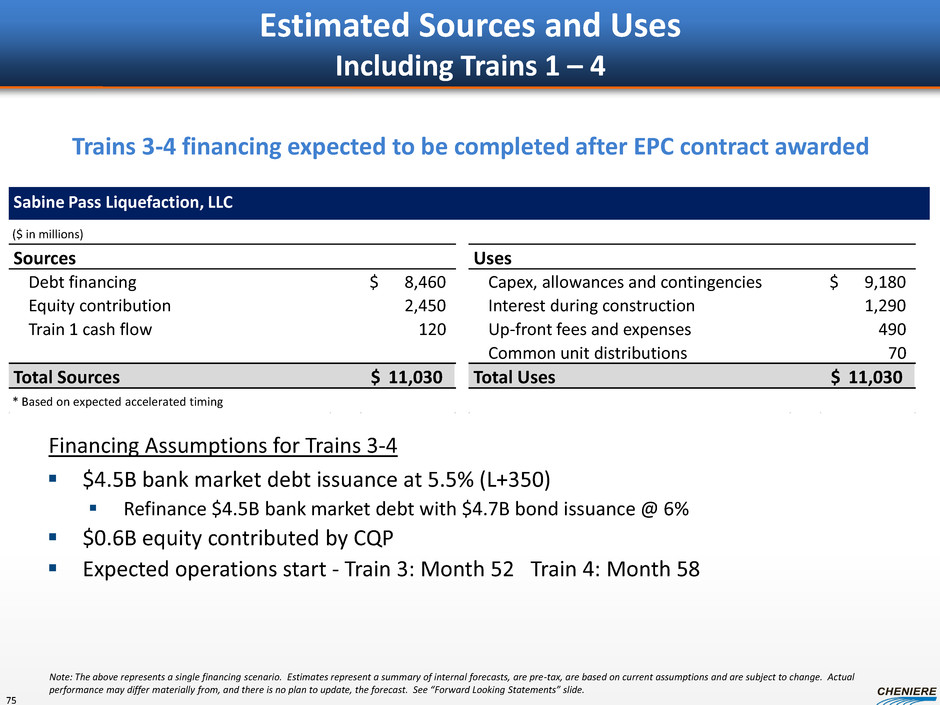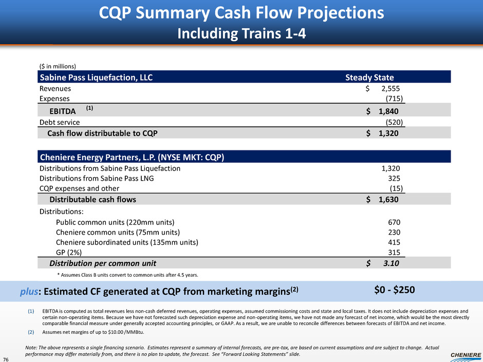 CQP Summary Cash Flow Projections Including Trains 1 and 2 Note: The above represents a single financing scenario. Estimates represent a summary of internal forecasts, are based on current assumptions and are subject to change. Actual performance may differ materially from, and there is no plan to update, the forecast. See “Forward Looking Statements” slide. (1) EBITDA is computed as total revenues less non-cash deferred revenues, operating expenses, assumed commissioning costs and state and local taxes. It does not include depreciation expenses and certain non-operating items. Because we have not forecasted such depreciation expense and non-operating items, we have not made any forecast of net income, which would be the most directly comparable financial measure under generally accepted accounting principles, or GAAP. As a result, we are unable to reconcile differences between forecasts of EBITDA and net income. (2) Assumes net margins of up to $10.00/MMBtu. plus: Estimated CF generated at CQP from marketing margins(2) $0 - $140 ($ in millions, except distribution per common unit ) Sabine Pass Liquefaction, LLC Steady State Revenues 1,100 $ Expenses (380) EBITDA (1) 720 $ Debt service (250) Cash flow distributable to CQP 470 $ Cheniere Energy Partners, L.P. (NYSE MKT: CQP) Distributions from Sabine Pass Liquefaction 470 Distributions from Sabine Pass LNG 185 CQP expenses and other (15) Distributable cash flows 640 $ Distributions: Public common units (205mm units) 350 Cheniere common units (75mm units) 125 Cheniere subordinated units (135mm units) 150 GP (2%) 15 Distribution per common unit 1.70 $ * Assumes Class B units convert to common units after 4.5 years. 74
