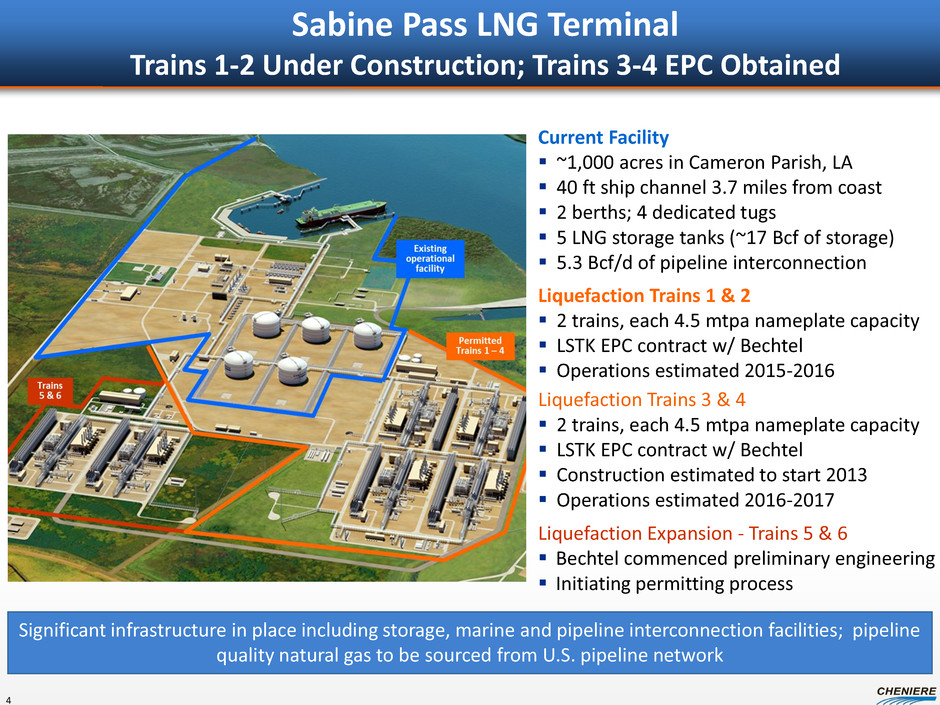 1 2 3 EPC Contracting Strategy: LSTK with Bechtel Three 4.5 mtpa nameplate liquefaction trains ConocoPhillips’ Optimized Cascade® Process Corpus Christi Liquefaction Project 13.5 mtpa Nameplate Plant (~1.8 Bcf/d of exports) 12 GE LM2500+ G4 gas turbine driven refrigerant compressors Three 160,000 m3 full-containment LNG tanks Two LNG carrier docks Artist rendition