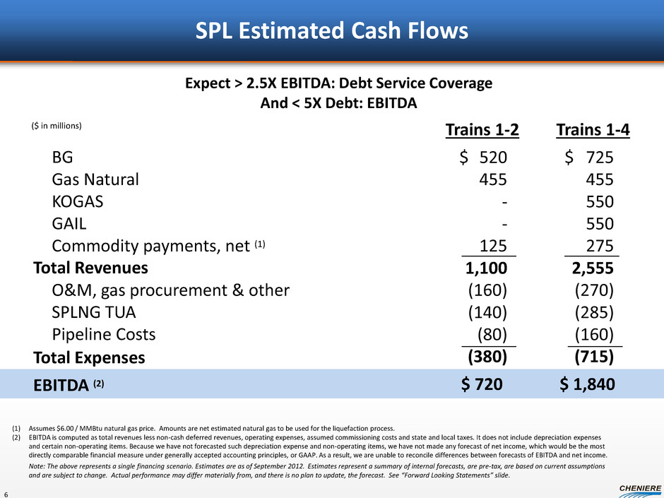 LNG Sale and Purchase Agreements (SPAs) (1) Conditions precedent must be satisfied by December 31, 2013 for KOGAS and GAIL (India) Ltd. or either party can terminate. CPs include financing, regulatory approvals and positive final investment decision. (2) A portion of the fee is subject to inflation, approximately 15% for BG Group, 13.6% for Gas Natural Fenosa and 15% for KOGAS and GAIL (India) Ltd. (3) Ratings may be changed, suspended or withdrawn at anytime and are not a recommendation to buy, hold or sell any security. (4) SPAs have a 20 year term with the right to extend up to an additional 10 years. Gas Natural Fenosa has an extension right up to an additional 12 years in certain circumstances. (5) BG will provide annual fixed fees of approximately $520 million during trains 1-2 operations and an additional $203 million once trains 3-4 are operational. (6) Total has agreed to purchase 104,750,000 MMBtu of LNG volumes annually upon the commencement of train 5 operations. Conditions precedent must be satisfied by June 30, 2015 or either party can terminate. CPs include financing, regulatory approvals and positive final investment decision. BG Gulf Coast LNG Gas Natural Fenosa Annual Contract Quantity (MMBtu) 286,500,000 Fixed Fees $/MMBtu (2) Annual Fixed Fees (5) ~$723 MM ~$454 MM Term (4) Guarantor 20 years BG Energy Holdings Ltd. Gas Natural SDG S.A. Corporate or Guarantor Credit Rating (3) A2/A Baa2/BBB/A- Fee During Force Majeure Up to 24 months Up to 24 months 20 years GAIL (India) Limited (1) ~$548 MM 20 years Baa2/NR/BBB- N/A ~18 mtpa “take-or-pay” style commercial agreements ~$2.6B annual fixed fee revenue for 20 years N/A Contract Start Date Train 1 + additional volumes with Trains 2,3,4 Train 2 Train 4 $2.25 - $3.00 $2.49 $3.00 182,500,000 182,500,000 20 years N/A N/A A+/A1 Train 3 $3.00 ~$548 MM Korea Gas Corporation (1) 182,500,000 5 ~$314 MM 20 years Aa1/AA N/A Total S.A. Train 5 $3.00 104,750,000 Total Gas & Power N.A.(6)