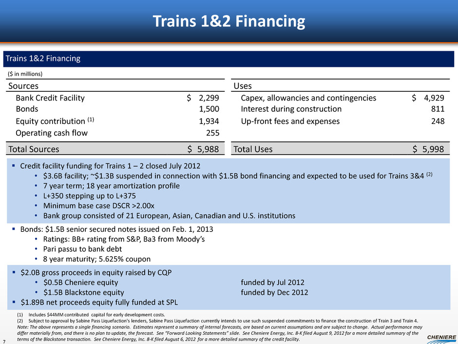 SPL Estimated Cash Flows Trains 1-4 Total Revenues Trains 1-2 BG Gas Natural KOGAS GAIL Commodity payments, net (1) O&M, gas procurement & other SPLNG TUA Pipeline Costs 520 455 - - 125 1,100 (160) (140) (80) (380) EBITDA (2) 725 455 550 550 275 2,555 (270) (285) (160) (715) $ 1,840 $ 720 $ $ ($ in millions) Total Expenses (1) Assumes $6.00 / MMBtu natural gas price. Amounts are net estimated natural gas to be used for the liquefaction process. (2) EBITDA is computed as total revenues less non-cash deferred revenues, operating expenses, assumed commissioning costs and state and local taxes. It does not include depreciation expenses and certain non-operating items. Because we have not forecasted such depreciation expense and non-operating items, we have not made any forecast of net income, which would be the most directly comparable financial measure under generally accepted accounting principles, or GAAP. As a result, we are unable to reconcile differences between forecasts of EBITDA and net income. Note: The above represents a single financing scenario. Estimates are as of September 2012. Estimates represent a summary of internal forecasts, are pre-tax, are based on current assumptions and are subject to change. Actual performance may differ materially from, and there is no plan to update, the forecast. See “Forward Looking Statements” slide. 6 Expect > 2.5X EBITDA: Debt Service Coverage And < 5X Debt: EBITDA
