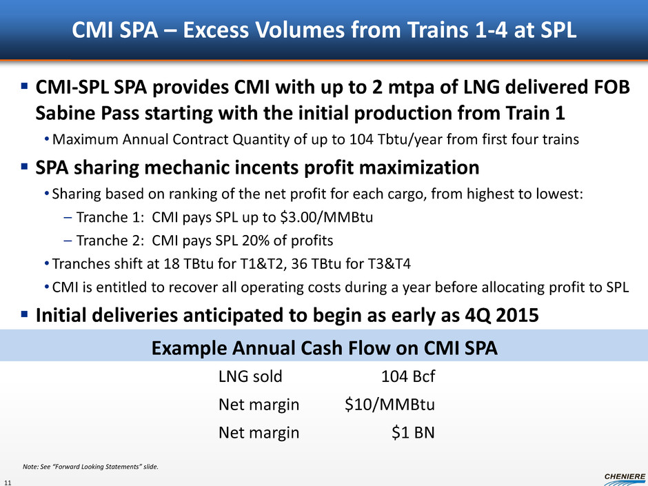 Sabine Pass Liquefaction Project Trains 5&6 – Status Update 10 Annual Contract Quantity (MMBtu) Fixed Fees $/MMBtu (2) Annual Fixed Fees Term (3) Guarantor Guarantor/Corporate Credit Rating (4) Fee During Force Majeure Contract Start Date ~$314 MM 20 years Aa1/AA N/A Total S.A. Train 5 $3.00 104,750,000 Total Gas & Power N.A.(1) Bechtel has commenced preliminary engineering Regulatory process expected to commence in 2013 Development of project is subject, but not limited, to: • Obtaining regulatory approvals • Entering into an EPC contract • Obtaining financing • Making a final investment decision Total SPA represents ~2.0 mtpa commencing with Train 5, ~$0.3B annual fixed fee revenue for 20 years (1) Total has agreed to purchase 91,250,000 MMBtu of LNG annually plus 13,500,000 MMBtu of seasonal LNG volumes upon the commencement of Train 5 operations. Conditions precedent must be satisfied by June 30, 2015 or either party can terminate. CPs include financing, regulatory approvals and positive final investment decision. (2) Approximately 11.5% of the fee is subject to annual adjustment for inflation. (3) SPA has a 20 year term with Total having the right to extend up to an additional 10 years. (4) Ratings may be changed, suspended or withdrawn at anytime and are not a recommendation to buy, hold or sell any security.