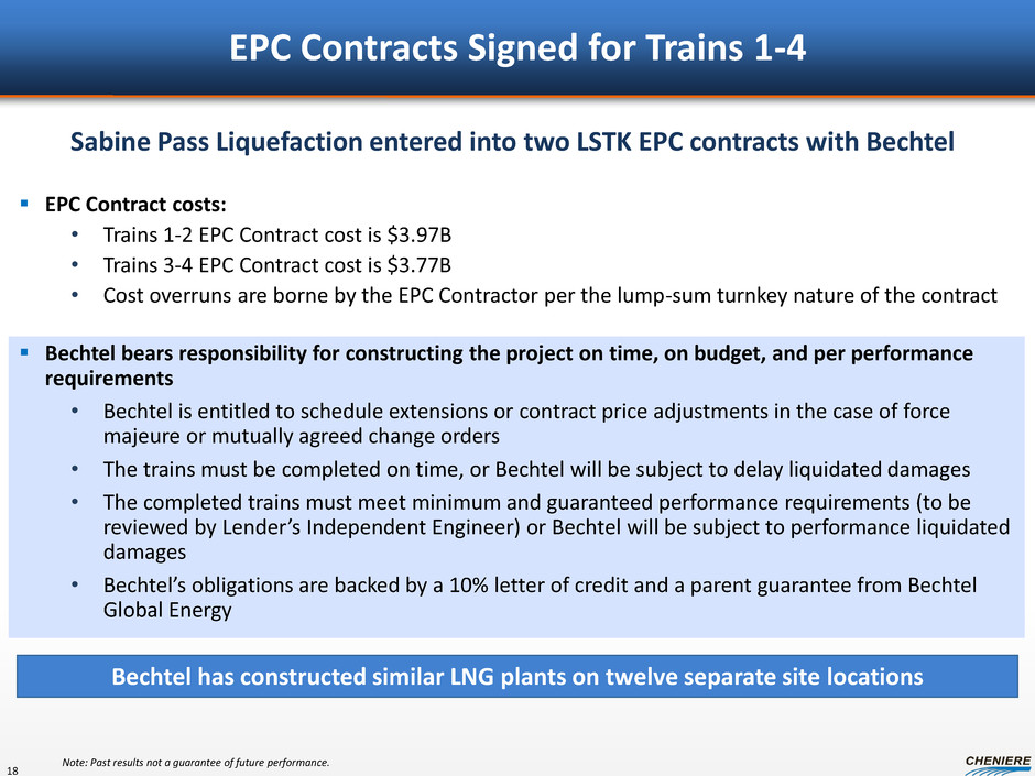 Key Credit Highlights Strong LNG market fundamentals Strategic location; brownfield development U.S. Gulf Coast region is a highly liquid natural gas market Strategically located near prolific natural gas basins and connected to the North American pipeline network by three large interstate pipeline systems Marine facilities, storage tanks and interconnecting pipelines already in place U.S. LNG exports provide access to LNG based on Henry Hub gas prices vs. oil prices LNG demand is the fastest-growing component of the global natural gas market Stable, contracted cash flows 18 mmtpa 20-year take-or-pay style agreements with investment grade counterparties • ~$2.6 B per year of fixed fees irrespective of actual nominated volumes • Variable price based on nominated volumes will be indexed to Henry Hub (115%) Proven technology and experienced EPC Provider ConocoPhillips Optimized Cascade® LNG Process proven in over 4 decades of operations Lump-sum, turnkey EPC Contracts with Bechtel 1/3 of liquefaction plants constructed by Bechtel, more than any other contractor Bechtel served as the EPC contractor for the construction of the Sabine Pass regasification terminal, which was completed on-time and on-budget Committed equity partners $1.5B equity from Blackstone, one of the world’s largest private equity investors, with significant energy investment $0.5B equity from Cheniere Energy, Inc. , underpinned by ~$468MM investment into Cheniere by Temasek Holdings and Asia-based private equity firm RRJ Capital Strong management Track record of planning, financing and executing on multi-billion dollar LNG projects 17