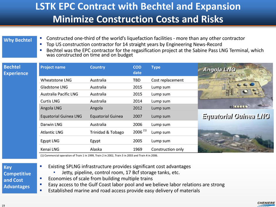 EPC Contracts Signed for Trains 1-4 EPC Contract costs: • Trains 1-2 EPC Contract cost is $3.97B • Trains 3-4 EPC Contract cost is $3.77B • Cost overruns are borne by the EPC Contractor per the lump-sum turnkey nature of the contract Sabine Pass Liquefaction entered into two LSTK EPC contracts with Bechtel Note: Past results not a guarantee of future performance. 18 Bechtel has constructed similar LNG plants on twelve separate site locations Bechtel bears responsibility for constructing the project on time, on budget, and per performance requirements • Bechtel is entitled to schedule extensions or contract price adjustments in the case of force majeure or mutually agreed change orders • The trains must be completed on time, or Bechtel will be subject to delay liquidated damages • The completed trains must meet minimum and guaranteed performance requirements (to be reviewed by Lender’s Independent Engineer) or Bechtel will be subject to performance liquidated damages • Bechtel’s obligations are backed by a 10% letter of credit and a parent guarantee from Bechtel Global Energy