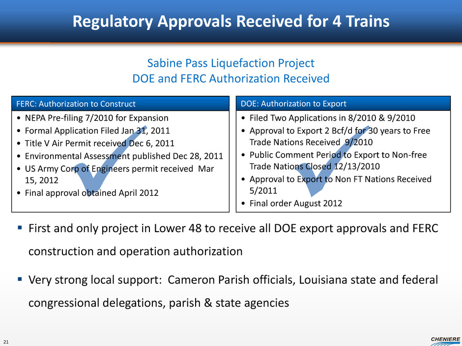 Construction Completion Schedules Trains 1-4 20 Note: See “Forward Looking Statements” slide. 2012 2013 2014 2015 2016 2017 2018 BG DFCD GN DFCD KOGAS DFCD GAIL DFCD Train 1 Train 2 Train 3 Train 4 SPA CP Fulfillment Deadline Accelerated Target – First LNG Record First LNG – Egyptian LNG T1 Current Plan estimates first LNG from Train 1 in 40 months • Bechtel schedule bonus provides incentive for early delivery • Bechtel’s record delivery was Egyptian LNG train 1, delivered in 36 months from NTP Bechtel LSTK for Trains 3&4 includes Guaranteed Substantial Completion dates of 48.5 and 57.5 months for Train 3 and Train 4, respectively, from NTP Early Engineering Accelerated Guaranteed Accelerated Guaranteed Guaranteed Guaranteed Feb 2016 Aug 2016 Mar 2018 Jun 2017 Nov 2016 Aug 2017 1 2 3 4 5 6 7 8 9 10 11 12 13 14 15 16 17 18 19 20 21 22 23 24 25 26 27 28 29 30 31 32 33 34 35 36 37 38 39 40 41 42 43 44 45 46 47 48 49 50 51 52 53 54 55 56 57 58 59 60 61 62 63 64 65 66 67 68