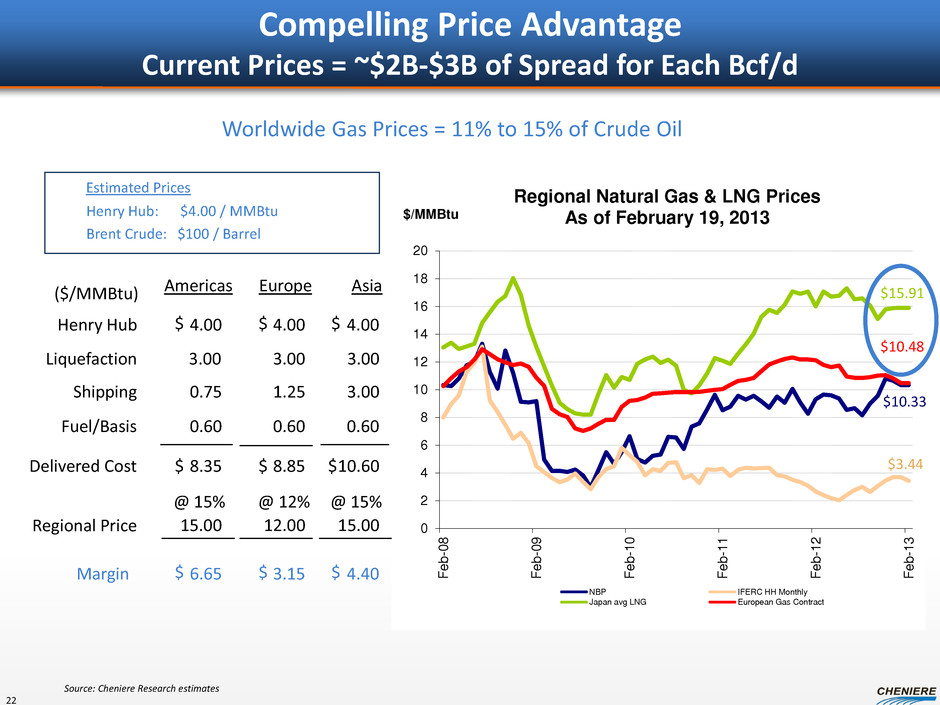 • NEPA Pre-filing 7/2010 for Expansion • Formal Application Filed Jan 31, 2011 • Title V Air Permit received Dec 6, 2011 • Environmental Assessment published Dec 28, 2011 • US Army Corp of Engineers permit received Mar 15, 2012 • Final approval obtained April 2012 • Filed Two Applications in 8/2010 & 9/2010 • Approval to Export 2 Bcf/d for 30 years to Free Trade Nations Received 9/2010 • Public Comment Period to Export to Non-free Trade Nations Closed 12/13/2010 • Approval to Export to Non FT Nations Received 5/2011 • Final order August 2012 Regulatory Approvals Received for 4 Trains FERC: Authorization to Construct DOE: Authorization to Export First and only project in Lower 48 to receive all DOE export approvals and FERC construction and operation authorization Very strong local support: Cameron Parish officials, Louisiana state and federal congressional delegations, parish & state agencies Sabine Pass Liquefaction Project DOE and FERC Authorization Received 21