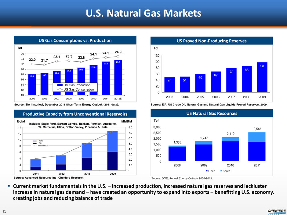 0 2 4 6 8 10 12 14 16 18 20 F e b -0 8 F e b -0 9 F e b -1 0 F e b -1 1 F e b -1 2 F e b -1 3 $/MMBtu Regional Natural Gas & LNG Prices As of February 19, 2013 NBP IFERC HH Monthly Japan avg LNG European Gas Contract Estimated Prices Henry Hub: $4.00 / MMBtu Brent Crude: $100 / Barrel ($/MMBtu) Americas Europe Asia Henry Hub 4.00 $ 4.00 4.00 Fuel/Basis Shipping 0.75 1.25 3.00 0.60 0.60 0.60 $ 8.35 8.85 10.60 4.40 Regional Price @ 15% 15.00 12.00 15.00 Margin 6.65 $ 3.15 Liquefaction 3.00 3.00 3.00 Delivered Cost Source: Cheniere Research estimates Compelling Price Advantage Current Prices = ~$2B-$3B of Spread for Each Bcf/d @ 12% @ 15% $ $ $ $ $ $ Worldwide Gas Prices = 11% to 15% of Crude Oil 22 $3.44 $10.33 $15.91 $10.48
