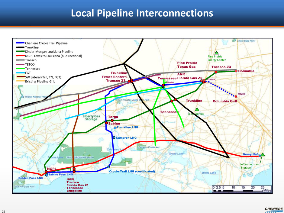 Montana Thrust Belt Cody Gammon Hilliard Baxter- Mancos Greater Green River Basin Forest City Basin Pierre Illinois Basin Piceance Basin Lewis San Juan Basin Raton Basin Anadarko Basin PaloDuro Basin Permian Basin Barnett Woodford Pearsall Eagle Ford Rio Grande Embayment Barnett Woodford Michigan Basin Antrim New Albany Chattanooga Texas Louisiana Mississippi Salt Basin Fayetteville Ft. Worth Basin Arkoma Basin Conasauga Black Warrior Basin Marfa Basin Paradox Basin Maverick Sub-Basin Hermosa Mancos Cherokee Platform Excello- Mulky Appalachian Basin Marcellus/Utica Shale Plays Basins 366 1,373 Lower 48 Recoverable Unconventional Reserves (Tcf) 0 700 1400 1996 2009 Shale CBM Tight Gas Total US Proved Reserves Sabine Pass LNG Haynesville Bossier Granite Wash Williston Basin Bakken Primary Gas Sources for Sabine Pass Liquefaction Conventional Gulf Coast Onshore; Barnett; Haynesville; Bossier; Eagle Ford Sources: EIA (US map graphic, pipelines and LNG terminals placed by Cheniere) Advanced Resources Intl (Lower 48 Unconventional Recoverable Reserves), ARI shale estimates updated April 2010 Depicted Pipelines: Rockies Express, Texas Eastern, Trunkline, Transco, FGT, C/P/SESH/Gulf Crossing (as a single route) Rig Count Production Bcf/d Barnett 31 5.7 Haynesville 32 7.1 Eagle Ford 169 2.5 Granite wash 106 1.6 Bakken 161 0.7 Marcellus 101 7.3 Source: Lippman Consulting and PIRA, as of Jan 2013 Uinta Strategically Located – Extensive Market Access to Gas 24