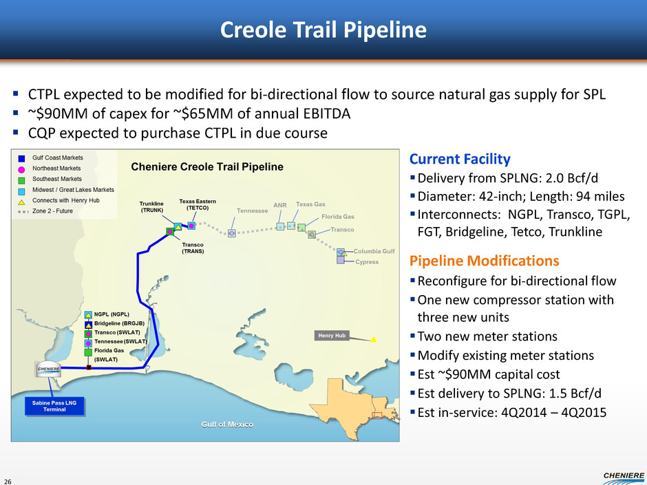 Local Pipeline Interconnections Targa Columbia Gulf Tennessee Cheniere Creole Trail Pipeline Trunkline Kinder Morgan Louisiana Pipeline NGPL Texas to Louisiana (bi-directional) Transco TETCO Tennessee FGT SW Lateral (Trn, TN, FGT) Existing Pipeline Grid Transco Z3 Sabine Pine Prairie Energy Center Egan Storage Jefferson Island Storage Creole Trail LNG (certificated) Pine Prairie Texas Gas ANR Florida Gas Z2 . Cameron LNG . Tennessee Trunkline Columbia Trunkline LNG . NGPL Transco Florida Gas Z1 Tennessee Bridgeline . NGPL Texas Eastern Trunkline Transco Z3 25