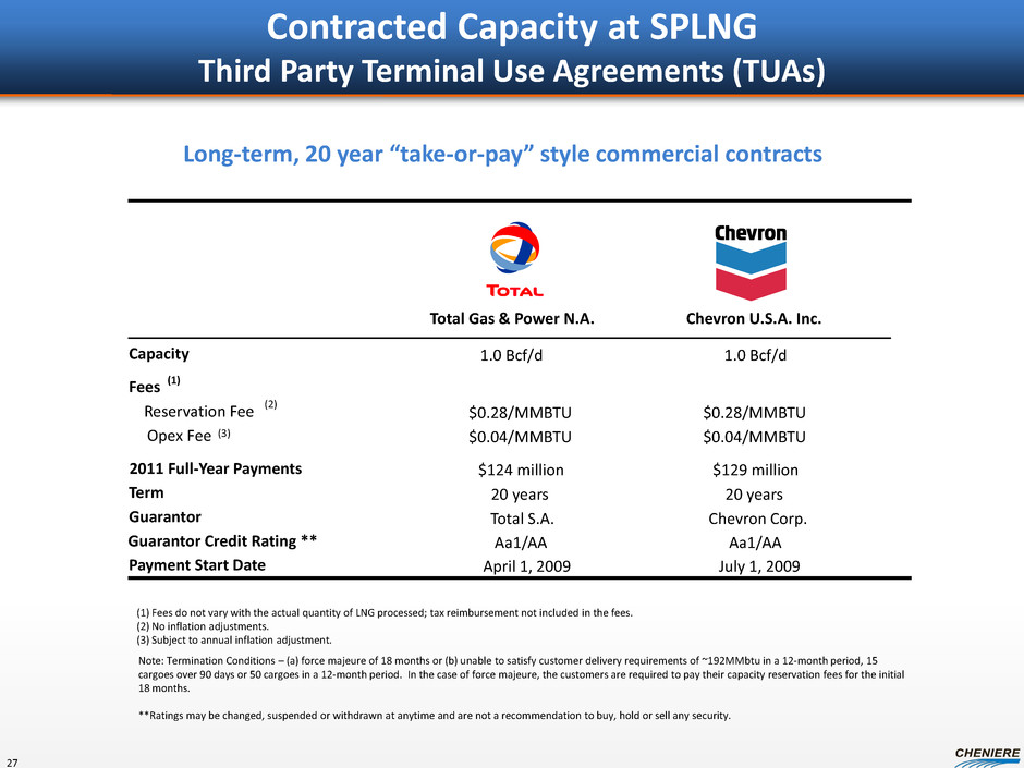 Current Facility Delivery from SPLNG: 2.0 Bcf/d Diameter: 42-inch; Length: 94 miles Interconnects: NGPL, Transco, TGPL, FGT, Bridgeline, Tetco, Trunkline Pipeline Modifications Reconfigure for bi-directional flow One new compressor station with three new units Two new meter stations Modify existing meter stations Est ~$90MM capital cost Est delivery to SPLNG: 1.5 Bcf/d Est in-service: 4Q2014 – 4Q2015 Creole Trail Pipeline CTPL expected to be modified for bi-directional flow to source natural gas supply for SPL ~$90MM of capex for ~$65MM of annual EBITDA CQP expected to purchase CTPL in due course 26