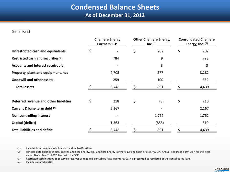 Condensed Balance Sheets As of December 31, 2012 (1) Includes intercompany eliminations and reclassifications. (2) For complete balance sheets, see the Cheniere Energy, Inc., Cheniere Energy Partners, L.P and Sabine Pass LNG, L.P. Annual Report on Form 10-K for the year ended December 31, 2012, filed with the SEC. (3) Restricted cash includes debt service reserves as required per Sabine Pass indenture. Cash is presented as restricted at the consolidated level. (4) Includes related parties. (in millions) Cheniere Energy Partners, L.P. Other Cheniere Energy, Inc. (1) Consolidated Cheniere Energy, Inc. (2) Unrestricted cash and equivalents $ - $ 202 $ 202 Restricted cash and securities (3) 784 9 793 Accounts and interest receivable - 3 3 Property, plant and equipment, net 2,705 577 3,282 Goodwill and other assets 259 100 359 Total assets $ 3,748 $ 891 $ 4,639 Deferred revenue and other liabilities $ 218 $ (8) $ 210 Current & long-term debt (4) 2,167 - 2,167 Non-controlling interest - 1,752 1,752 Capital (deficit) 1,363 (853) 510 Total liabilities and deficit $ 3,748 $ 891 $ 4,639