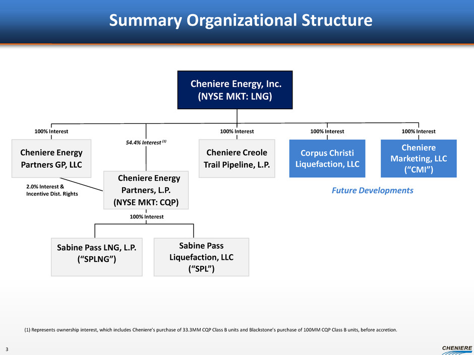 Forward Looking Statements 2 This presentation contains certain statements that are, or may be deemed to be, “forward-looking statements within the meaning of Section 27A of the Securities Act of 1933, as amended, and Section 21E of the Securities Exchange Act of 1934, as amended”. All statements, other than statements of historical facts, included herein are “forward-looking statements.” Included among “forward-looking statements” are, among other things: statements regarding our ability to pay distributions to our unitholders; statements regarding our expected receipt of cash distributions from Cheniere Energy Partners, L.P., Sabine Pass LNG, L.P. or Sabine Pass Liquefaction, LLC; statements that we expect to commence or complete construction of our proposed LNG terminal or our proposed pipelines, liquefaction facilities or other projects, or any expansions thereof, by certain dates or at all; statements regarding future levels of domestic and international natural gas production, supply or consumption or future levels of liquefied natural gas (“LNG”) imports into or exports from North America and other countries worldwide, regardless of the source of such information, or the transportation or demand for and prices related to natural gas, LNG or other hydrocarbon products; statements regarding any financing transactions or arrangements, or ability to enter into such transactions; statements relating to the construction of our Trains, including statements concerning the engagement of any engineering, procurement and construction ("EPC") contractor or other contractor and the anticipated terms and provisions of any agreement with any EPC or other contractor, and anticipated costs related thereto; statements regarding any arrangement to be entered into or performed substantially in the future, including any revenues anticipated to be received and the anticipated timing thereof, and statements regarding the amounts of total LNG regasification, liquefaction or storage capacities that are, or may become, subject to contracts; statements regarding counterparties to our commercial contracts, construction contracts and other contracts; statements regarding the anticipated drop down of the Creole Trail Pipeline from Cheniere Energy, Inc. to Cheniere Energy Partners, L.P.; statements regarding our planned construction of additional Trains, including the financing of such trains; statements that our Trains, when completed, will have certain characteristics, including amounts of liquefaction capacities; statements regarding any business strategy, our strengths, our business and operation plans or any other plans, forecasts, projections or objectives, including anticipated revenues and capital expenditures, any or all of which are subject to change; statements regarding projections of revenues, expenses, earnings or losses, working capital or other financial items; statements regarding legislative, governmental, regulatory, administrative or other public body actions, requirements, permits, investigations, proceedings or decisions; statements regarding our anticipated LNG and natural gas marketing activities; and any other statements that relate to non-historical or future information. These forward-looking statements are often identified by the use of terms and phrases such as “achieve,” “anticipate,” “believe,” “contemplate,” “develop,” “estimate,” “example,” “expect,” “forecast,” “opportunities,” “plan,” “potential,” “project,” “propose,” “subject to,” “strategy,” and similar terms and phrases. Although we believe that the expectations reflected in these forward-looking statements are reasonable, they do involve assumptions, risks and uncertainties, and these expectations may prove to be incorrect. You should not place undue reliance on these forward-looking statements, which speak only as of the date of this presentation. Our actual results could differ materially from those anticipated in these forward-looking statements as a result of a variety of factors, including those discussed in “Risk Factors” in the Cheniere Energy, Inc. and Cheniere Energy Partners, L.P. Annual Reports on Form 10-K filed with the SEC on February 22, 2013, each as amended by Amendment No. 1 on Form 10-K/A filed with the SEC on March 1, 2013, which are incorporated by reference into this presentation. All forward-looking statements attributable to us or persons acting on our behalf are expressly qualified in their entirety by these ”Risk Factors”. These forward-looking statements are made as of the date of this presentation, and we undertake no obligation to publicly update or revise any forward-looking statements.
