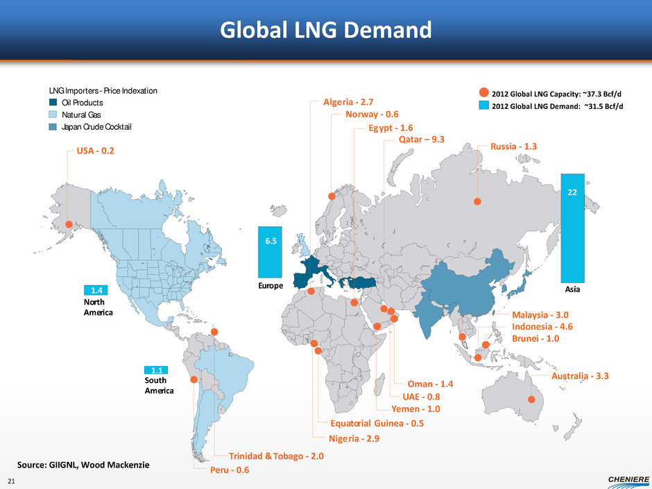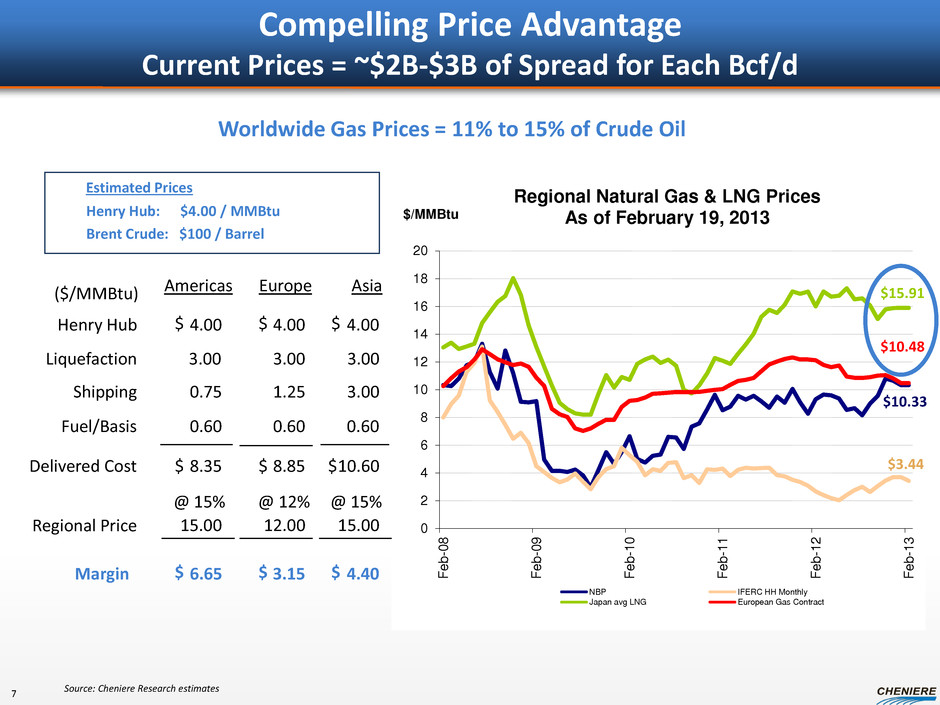 0 2 4 6 8 10 12 14 16 18 20 F e b -0 8 F e b -0 9 F e b -1 0 F e b -1 1 F e b -1 2 F e b -1 3 $/MMBtu Regional Natural Gas & LNG Prices As of February 19, 2013 NBP IFERC HH Monthly Japan avg LNG European Gas Contract Estimated Prices Henry Hub: $4.00 / MMBtu Brent Crude: $100 / Barrel ($/MMBtu) Americas Europe Asia Henry Hub 4.00 $ 4.00 4.00 Fuel/Basis Shipping 0.75 1.25 3.00 0.60 0.60 0.60 $ 8.35 8.85 10.60 4.40 Regional Price @ 15% 15.00 12.00 15.00 Margin 6.65 $ 3.15 Liquefaction 3.00 3.00 3.00 Delivered Cost Source: Cheniere Research estimates Compelling Price Advantage Current Prices = ~$2B-$3B of Spread for Each Bcf/d @ 12% @ 15% $ $ $ $ $ $ Worldwide Gas Prices = 11% to 15% of Crude Oil $3.44 $10.33 $15.91 $10.48 7