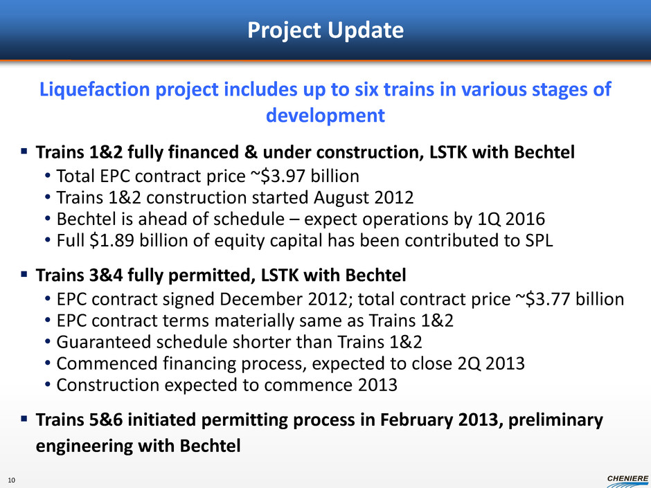 Summary Organizational Structure Cheniere Energy, Inc. (NYSE MKT: LNG) Cheniere Energy Partners, L.P. (NYSE MKT: CQP) Sabine Pass LNG, L.P. (SPLNG) BG SPA (286.5 million MMBtu / yr) Gas Natural SPA (182.5 million MMBtu / yr) KOGAS SPA (182.5 million MMBtu / yr) GAIL SPA (182.5 million MMBtu / yr) Total TUA (1 Bcf/d) Chevron TUA (1 Bcf/d) SPL TUA (2 Bcf/d) $420 Sr Secured Notes due 2020 $1,666 Sr Secured Notes due 2016 ($ in millions) No Debt Cheniere Creole Trail Pipeline, L.P. (CTPL) Corpus Christi Liquefaction, LLC Train 1 & Train 2 (financing completed) • $2,299 Credit Facility (1) • $1,500 Sr Secured Notes due 2021 (2) CMI SPA (up to 104 million MMBtu / yr) Total SPA (104.8 million MMBtu / yr) Sabine Pass Liquefaction, LLC (SPL) Remaining Financing: Trains 3&4 Estimated capital needs of $5B+ for Trains 3&4 Construction for Trains 3&4 expected to commence 2013 (1) Excludes ~$1.3B of the $3.6B Credit Facility that has been suspended and extended until December 31, 2013. Subject to approval by SPL’s lenders, SPL currently intends to use such suspended commitments to finance the construction of Train 3 and Train 4. (2) $1.5B bond offering in February 2013 used to refinance a portion of the $3.6B Credit Facility. 56.4% Cheniere Energy, Inc. 30.0% Blackstone 13.6% Public 12