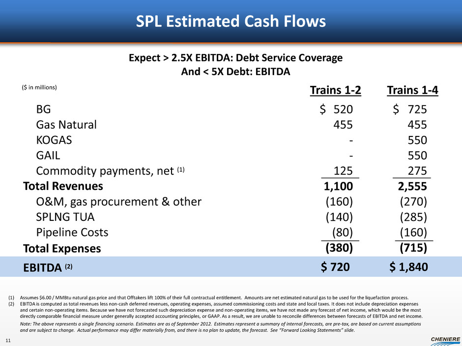 SPL Estimated Cash Flows Trains 1-4 Total Revenues Trains 1-2 BG Gas Natural KOGAS GAIL Commodity payments, net (1) O&M, gas procurement & other SPLNG TUA Pipeline Costs 520 455 - - 125 1,100 (160) (140) (80) (380) EBITDA (2) 725 455 550 550 275 2,555 (270) (285) (160) (715) $ 1,840 $ 720 $ $ ($ in millions) Total Expenses (1) Assumes $6.00 / MMBtu natural gas price and that Offtakers lift 100% of their full contractual entitlement. Amounts are net estimated natural gas to be used for the liquefaction process. (2) EBITDA is computed as total revenues less non-cash deferred revenues, operating expenses, assumed commissioning costs and state and local taxes. It does not include depreciation expenses and certain non-operating items. Because we have not forecasted such depreciation expense and non-operating items, we have not made any forecast of net income, which would be the most directly comparable financial measure under generally accepted accounting principles, or GAAP. As a result, we are unable to reconcile differences between forecasts of EBITDA and net income. Note: The above represents a single financing scenario. Estimates are as of September 2012. Estimates represent a summary of internal forecasts, are pre-tax, are based on current assumptions and are subject to change. Actual performance may differ materially from, and there is no plan to update, the forecast. See “Forward Looking Statements” slide. Expect > 2.5X EBITDA: Debt Service Coverage And < 5X Debt: EBITDA 11