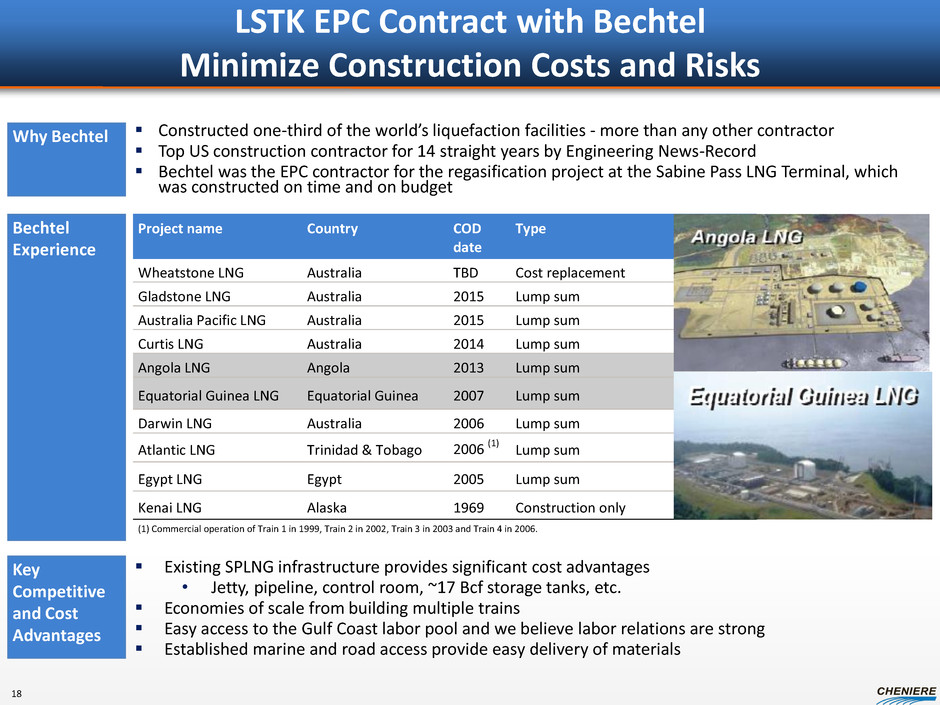 2012 2013 2014 2015 2016 2017 2018 1 2 3 4 5 6 7 8 9 10 11 12 13 14 15 16 17 18 19 20 21 22 23 24 25 26 27 28 29 30 31 32 33 34 35 36 37 38 39 40 41 42 43 44 45 46 47 48 49 50 51 52 53 54 55 56 57 58 59 60 61 62 63 64 65 66 67 68 69 70 71 72 73 74 Guaranteed Accelerated Guaranteed Accelerated Early Engineering Guaranteed Guaranteed Construction Completion Schedules Trains 1-4 Note: See “Forward Looking Statements” slide. Current plan estimates Train 1 operational in 40 months • Bechtel schedule bonus provides incentive for early delivery • Bechtel’s record delivery was Egyptian LNG train 1, delivered in 36 months from NTP Bechtel LSTK for Trains 3&4 includes Guaranteed Substantial Completion dates of 48.5 and 57.5 months from NTP for Train 3 and Train 4, respectively • LSTK pricing valid through June 1, 2013 BG DFCD GN DFCD KOGAS DFCD GAIL DFCD Record First LNG – Eqyptian LNG T1 Accelerated Target – First LNG Train 1 Train 2 Train 3 Train 4 SPA CP Fulfillment Deadline Feb 2016 June 2016 Jun 2017 Mar 2018 17