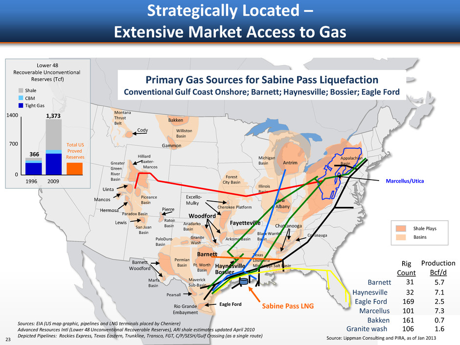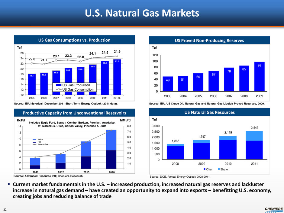 US Gas Consumptions vs. Production US Proved Non-Producing Reserves Productive Capacity from Unconventional Reservoirs Tcf Bcf/d MMB/d Current market fundamentals in the U.S. – increased production, increased natural gas reserves and lackluster increase in natural gas demand – have created an opportunity to expand into exports – benefitting U.S. economy, creating jobs and reducing balance of trade Source: EIA historical, December 2011 Short-Term Energy Outlook (2011 data). 49 51 60 67 78 85 98 0 20 40 60 80 100 120 2003 2004 2005 2006 2007 2008 2009 Source: EIA, US Crude Oil, Natural Gas and Natural Gas Liquids Proved Reserves, 2009. Source: Advanced Resource Intl; Cheniere Research. U.S. Natural Gas Markets 18.1 18.5 19.3 20.2 20.6 21.6 23.0 23.6 22.0 21.7 23.1 23.3 22.8 24.1 24.5 24.9 10 12 14 16 18 20 22 24 26 2005 2006 2007 2008 2009 2010 2011 2012E US Gas Production US Gas Consumption Tcf Includes Eagle Ford, Barnett Combo, Bakken, Permian, Anadarko, W. Marcellus, Utica, Cotton Valley, Piceance & Uinta US Natural Gas Resources Tcf 1,365 1,747 2,119 2,543 0 500 1,000 1,500 2,000 2,500 3,000 2008 2009 2010 2011 Oher Shale Source: DOE, Annual Energy Outlook 2008-2011. 22