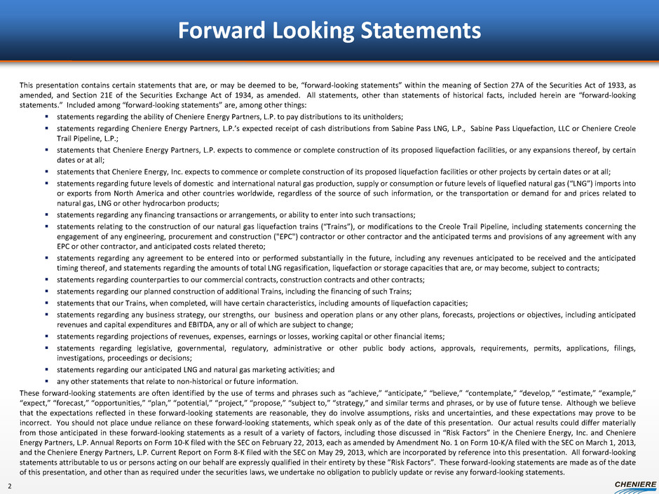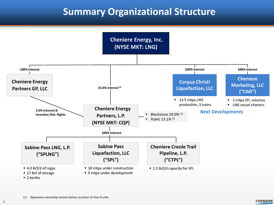 Forward Looking Statements 2 This presentation contains certain statements that are, or may be deemed to be, “forward-looking statements” within the meaning of Section 27A of the Securities Act of 1933, as amended, and Section 21E of the Securities Exchange Act of 1934, as amended. All statements, other than statements of historical facts, included herein are “forward-looking statements.” Included among “forward-looking statements” are, among other things: statements regarding the ability of Cheniere Energy Partners, L.P. to pay distributions to its unitholders; statements regarding Cheniere Energy Partners, L.P.’s expected receipt of cash distributions from Sabine Pass LNG, L.P., Sabine Pass Liquefaction, LLC or Cheniere Creole Trail Pipeline, L.P.; statements that Cheniere Energy Partners, L.P. expects to commence or complete construction of its proposed liquefaction facilities, or any expansions thereof, by certain dates or at all; statements that Cheniere Energy, Inc. expects to commence or complete construction of its proposed liquefaction facilities or other projects by certain dates or at all; statements regarding future levels of domestic and international natural gas production, supply or consumption or future levels of liquefied natural gas (“LNG”) imports into or exports from North America and other countries worldwide, regardless of the source of such information, or the transportation or demand for and prices related to natural gas, LNG or other hydrocarbon products; statements regarding any financing transactions or arrangements, or ability to enter into such transactions; statements relating to the construction of our natural gas liquefaction trains (“Trains”), or modifications to the Creole Trail Pipeline, including statements concerning the engagement of any engineering, procurement and construction ("EPC") contractor or other contractor and the anticipated terms and provisions of any agreement with any EPC or other contractor, and anticipated costs related thereto; statements regarding any agreement to be entered into or performed substantially in the future, including any revenues anticipated to be received and the anticipated timing thereof, and statements regarding the amounts of total LNG regasification, liquefaction or storage capacities that are, or may become, subject to contracts; statements regarding counterparties to our commercial contracts, construction contracts and other contracts; statements regarding our planned construction of additional Trains, including the financing of such Trains; statements that our Trains, when completed, will have certain characteristics, including amounts of liquefaction capacities; statements regarding any business strategy, our strengths, our business and operation plans or any other plans, forecasts, projections or objectives, including anticipated revenues and capital expenditures and EBITDA, any or all of which are subject to change; statements regarding projections of revenues, expenses, earnings or losses, working capital or other financial items; statements regarding legislative, governmental, regulatory, administrative or other public body actions, approvals, requirements, permits, applications, filings, investigations, proceedings or decisions; statements regarding our anticipated LNG and natural gas marketing activities; and any other statements that relate to non-historical or future information. These forward-looking statements are often identified by the use of terms and phrases such as “achieve,” “anticipate,” “believe,” “contemplate,” “develop,” “estimate,” “example,” “expect,” “forecast,” “opportunities,” “plan,” “potential,” “project,” “propose,” “subject to,” “strategy,” and similar terms and phrases, or by use of future tense. Although we believe that the expectations reflected in these forward-looking statements are reasonable, they do involve assumptions, risks and uncertainties, and these expectations may prove to be incorrect. You should not place undue reliance on these forward-looking statements, which speak only as of the date of this presentation. Our actual results could differ materially from those anticipated in these forward-looking statements as a result of a variety of factors, including those discussed in “Risk Factors” in the Cheniere Energy, Inc. and Cheniere Energy Partners, L.P. Annual Reports on Form 10-K filed with the SEC on February 22, 2013, each as amended by Amendment No. 1 on Form 10-K/A filed with the SEC on March 1, 2013, and the Cheniere Energy Partners, L.P. Current Report on Form 8-K filed with the SEC on May 29, 2013, which are incorporated by reference into this presentation. All forward-looking statements attributable to us or persons acting on our behalf are expressly qualified in their entirety by these ”Risk Factors”. These forward-looking statements are made as of the date of this presentation, and other than as required under the securities laws, we undertake no obligation to publicly update or revise any forward-looking statements.