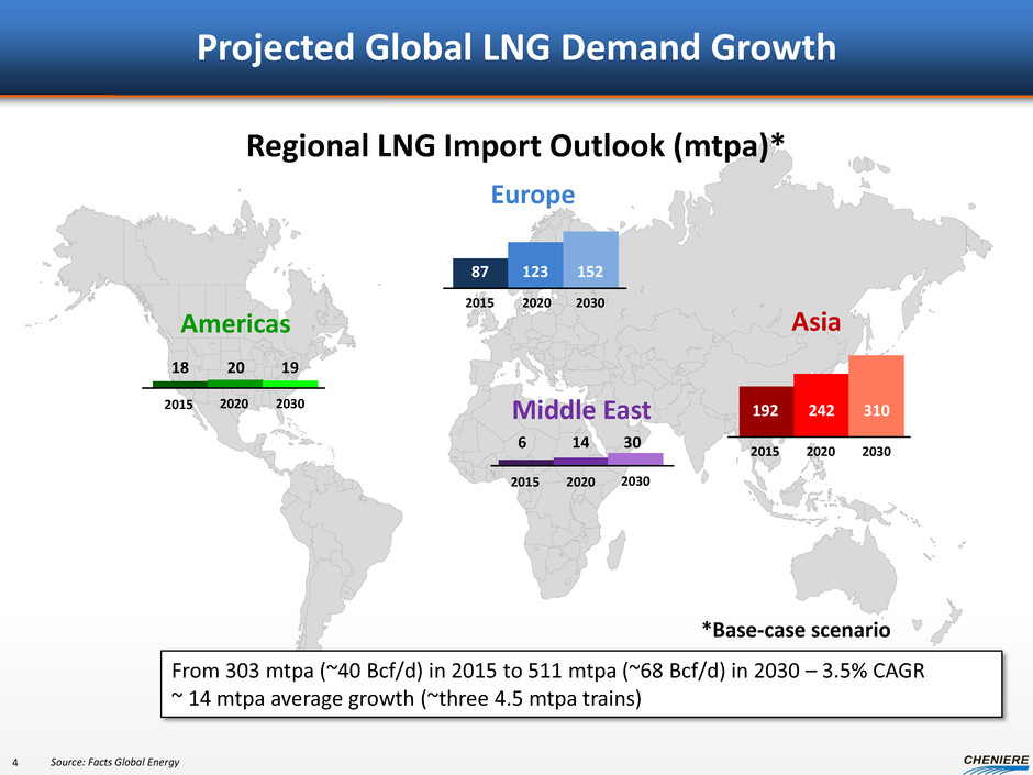 2.0% Interest & Incentive Dist. Rights Cheniere Energy, Inc. (NYSE MKT: LNG) Sabine Pass LNG, L.P. (“SPLNG”) Sabine Pass Liquefaction, LLC (“SPL”) Cheniere Energy Partners, L.P. (NYSE MKT: CQP) Cheniere Creole Trail Pipeline, L.P. (“CTPL”) Corpus Christi Liquefaction, LLC Cheniere Marketing, LLC (“CMI”) Cheniere Energy Partners GP, LLC 55.9% Interest (1) 100% Interest 100% Interest 100% Interest 100% Interest (1) Represents ownership interest before accretion of Class B units. Next Developments Summary Organizational Structure 3 Blackstone 29.0% (1) Public 13.1% (1) 13.5 mtpa LNG production, 3 trains 4.0 Bcf/d of regas 17 Bcf of storage 2 berths 2 mtpa SPL volumes LNG vessel charters 1.5 Bcf/d capacity for SPL 18 mtpa under construction 9 mtpa under development