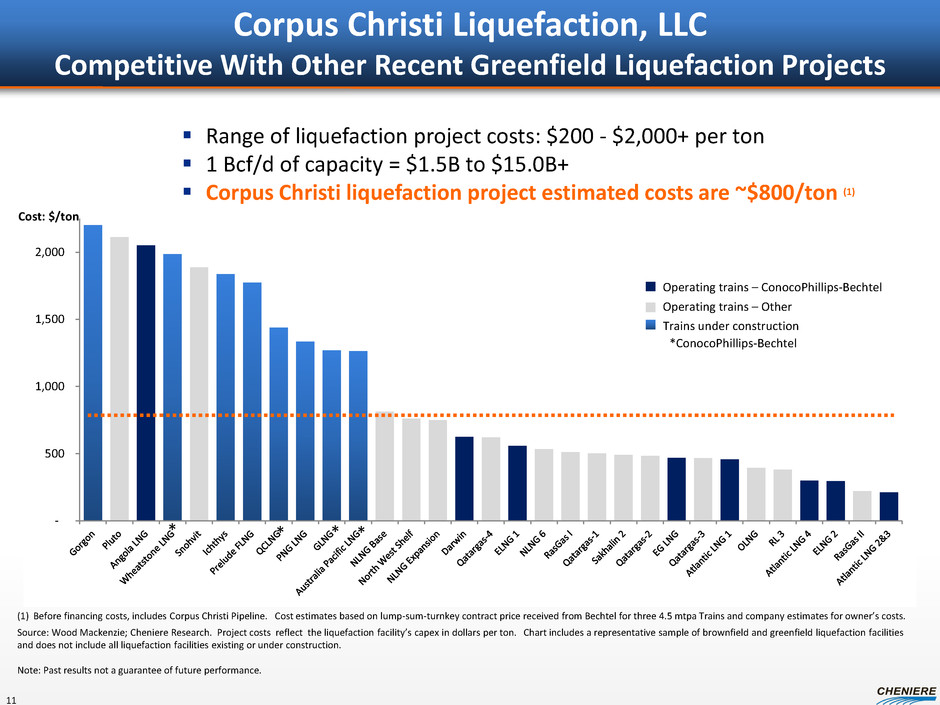Corpus Christi Liquefaction Project Proposed 3 Train Facility >1,000 acres owned and/or controlled 2 berths, 3 LNG storage tanks (~10.1 Bcfe of storage) ConocoPhillips’ Optimized Cascade® Process Key Project Attributes Marine environment conducive to large tankers • 45 ft ship channel 13.7 miles from coast • Protected berth Premier Site Conditions • Established industrial zone • Elevated site protects from storm surge • Soils do not require piles • Local labor, infrastructure & utilities • Proximate pipeline interconnections to 4.5 Bcf/d receipt/takeaway capacity Project Update Contract price received from Bechtel Estimated costs, including owner’s cost, ~$800/ton Proceeding with commercialization Anticipating FID toward the end of 2014 First LNG expected 2018 Houston New Orleans Gulf of Mexico Corpus Christi All major permit applications have been filed, EPC contract price received 10 Artist’s rendition Design production capacity is expected to be ~4.5 mtpa per train