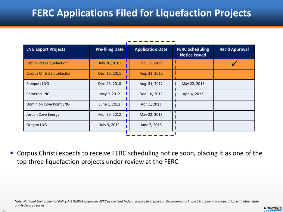Regulatory Approvals LNG Export Projects Corpus Christi Trains 1-3: Filed FERC and DOE applications • Completed and filed FERC application in 8/2012 (NEPA pre-filing process initiated in 8/2011) − Corpus Christi is one of six liquefaction projects to have filed a FERC application • Filed for FTA and non-FTA authorizations in 8/2012 to export ~15.0 mtpa • Received FTA authorizations in 10/2012 • Non-FTA authorizations are pending; Corpus Christi is #6 on the DOE “Order of Precedence” SPL Trains 5-6: Commenced FERC and DOE filing process • Initiated FERC’s NEPA pre-filing in Feb. 2013; application expected to be completed and filed 2H13 • Filed for FTA and non-FTA authorizations to export ~2.0 mtpa under Total SPA in 2/2013 and ~1.75 mtpa under Centrica SPA in 4/2013 • Received FTA authorizations to export LNG under Total and Centrica SPAs in 7/2013 • Non-FTA authorizations for the Total and Centrica SPAs are pending DOE export approvals and FERC construction and operation approvals needed for Corpus Christi Liquefaction Trains 1-3 and Sabine Pass Liquefaction Trains 5&6 12