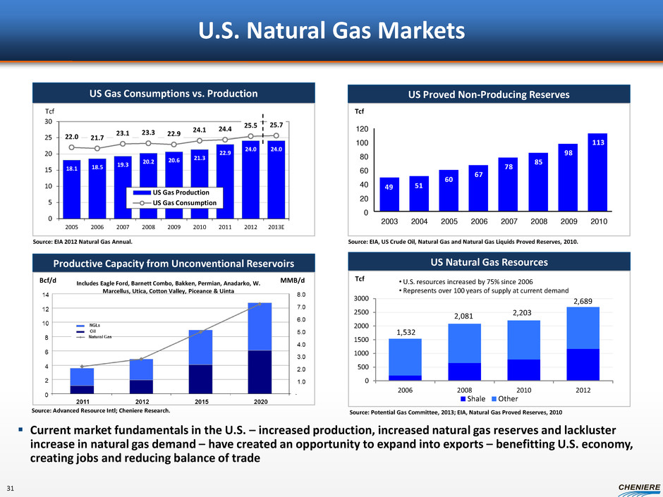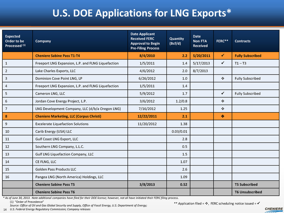 Source: Office of Oil and Gas Global Security and Supply, Office of Fossil Energy, U.S. Department of Energy; U.S. Federal Energy Regulatory Commission; Company releases U.S. DOE Applications for LNG Exports* ** Application filed = v, FERC scheduling notice issued = 14 Expected Order to be Processed (1) Company Date Applicant Received FERC Approval to Begin Pre-Filing Process Quantity (Bcf/d) Date Non FTA Received FERC** Contracts Cheniere Sabine Pass T1-T4 8/4/2010 2.2 5/20/2011 Fully Subscribed 1 Freeport LNG Expansion, L.P. and FLNG Liquefaction 1/5/2011 1.4 5/17/2013 T1 – T3 2 Lake Charles Exports, LLC 4/6/2012 2.0 8/7/2013 3 Dominion Cove Point LNG, LP 6/26/2012 1.0 v Fully Subscribed 4 Freeport LNG Expansion, L.P. and FLNG Liquefaction 1/5/2011 1.4 5 Cameron LNG, LLC 5/9/2012 1.7 Fully Subscribed 6 Jordan Cove Energy Project, L.P. 3/6/2012 1.2/0.8 v 7 LNG Development Company, LLC (d/b/a Oregon LNG) 7/16/2012 1.25 v 8 Cheniere Marketing, LLC (Corpus Christi) 12/22/2011 2.1 v 9 Excelerate Liquefaction Solutions 11/20/2012 1.38 10 Carib Energy (USA) LLC 0.03/0.01 11 Gulf Coast LNG Export, LLC 2.8 12 Southern LNG Company, L.L.C. 0.5 13 Gulf LNG Liquefaction Company, LLC 1.5 14 CE FLNG, LLC 1.07 15 Golden Pass Products LLC 2.6 16 Pangea LNG (North America) Holdings, LLC 1.09 Cheniere Sabine Pass T5 3/8/2013 0.52 T5 Subscribed Cheniere Sabine Pass T6 T6 Unsubscribed * As of June 30, 2013. Note additional companies have filed for their DOE license; however, not all have initiated their FERC filing process. (1) “Order of Precedence”