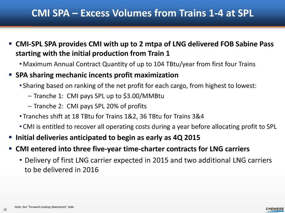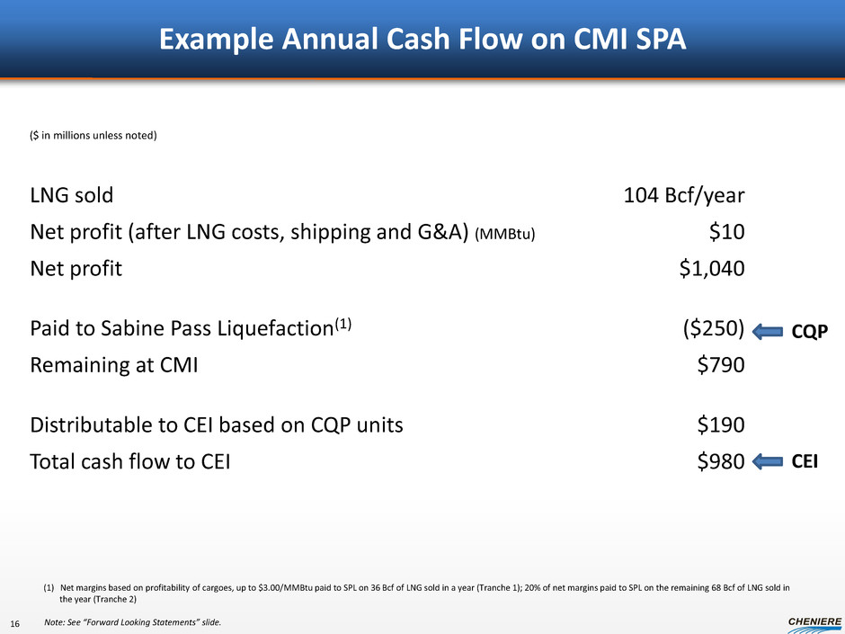 CMI SPA – Excess Volumes from Trains 1-4 at SPL CMI-SPL SPA provides CMI with up to 2 mtpa of LNG delivered FOB Sabine Pass starting with the initial production from Train 1 •Maximum Annual Contract Quantity of up to 104 TBtu/year from first four Trains SPA sharing mechanic incents profit maximization • Sharing based on ranking of the net profit for each cargo, from highest to lowest: – Tranche 1: CMI pays SPL up to $3.00/MMBtu – Tranche 2: CMI pays SPL 20% of profits • Tranches shift at 18 TBtu for Trains 1&2, 36 TBtu for Trains 3&4 • CMI is entitled to recover all operating costs during a year before allocating profit to SPL Initial deliveries anticipated to begin as early as 4Q 2015 CMI entered into three five-year time-charter contracts for LNG carriers • Delivery of first LNG carrier expected in 2015 and two additional LNG carriers to be delivered in 2016 Note: See “Forward Looking Statements” slide. 15